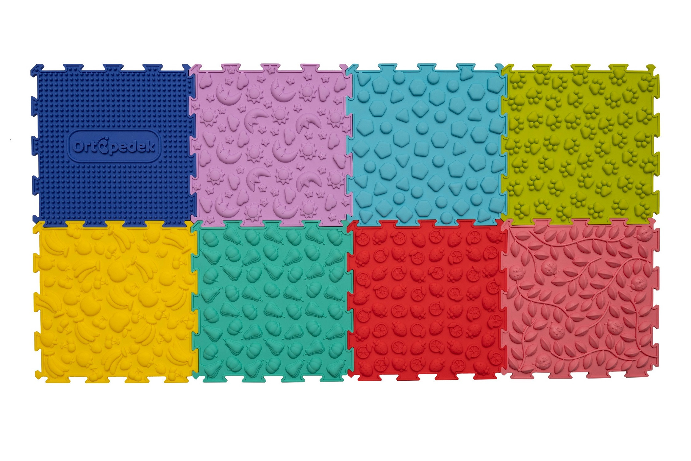 Obsah sady: 8 barevných senzorických podložek o rozměrech 24,5 x 24,5 cm.