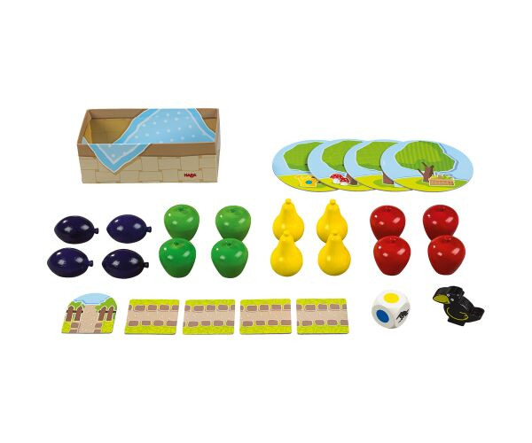 Obsah balení: 1 havran, 1 ovocný koš, 4 zelená jablka, 4 červená jablka, 4 žluté hrušky, 4 modré švestky, 5 karet cesty, 4 stromy, 1 hrací kostka, pravidla hry.