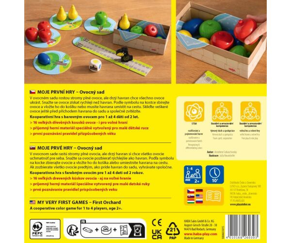 Zábavná hra pro nejmenší děti je velmi pěkně zpracovaná. Pravidla jsou přizpůsobena malým dětem a herní materiál je uzpůsoben pro malé dětské ruce. Hra je určena pro děti od 2 let. Počet hráčů je 2 až 4, doba jedné hry je cca 10 minut. Cílem hry je pracovat společně jako jeden tým, snažte se posbírat všechno barevné ovoce ze stromů v sadě dříve, než nenažraný havran přijde na konec své cesty. Pokud se vám to podaří, vyhráváte všichni společně. Hra podporuje rozvoj jemné motoriky a spolupráci.