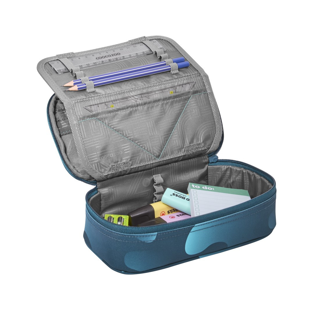 Prostorný penál pro uložení psacích potřeb, pravítek a dalších školních nebo osobních předmětů. Penál je uzavíratelný na zip. Uvnitř penálu najdete 21 poutek na pera a tužky pro přehledné upořádání.