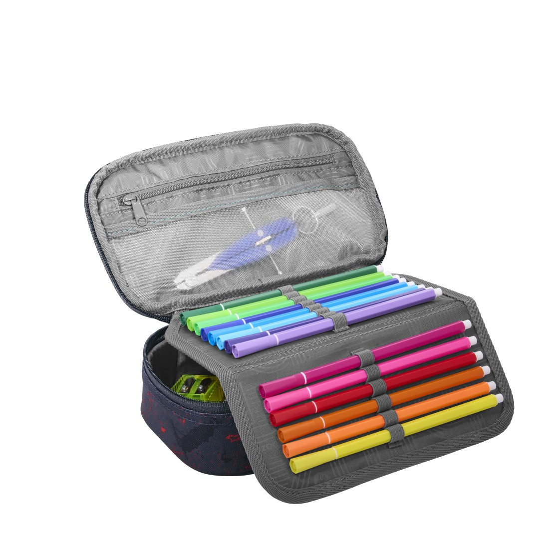 Prostorný penál pro uložení psacích potřeb, pravítek a dalších školních nebo osobních předmětů. Penál je uzavíratelný na zip. Uvnitř penálu najdete 21 poutek na pera a tužky pro přehledné upořádání.