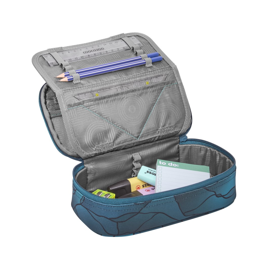 Prostorný penál pro uložení psacích potřeb, pravítek a dalších školních nebo osobních předmětů. Penál je uzavíratelný na zip. Uvnitř penálu najdete 21 poutek na pera a tužky pro přehledné upořádání.