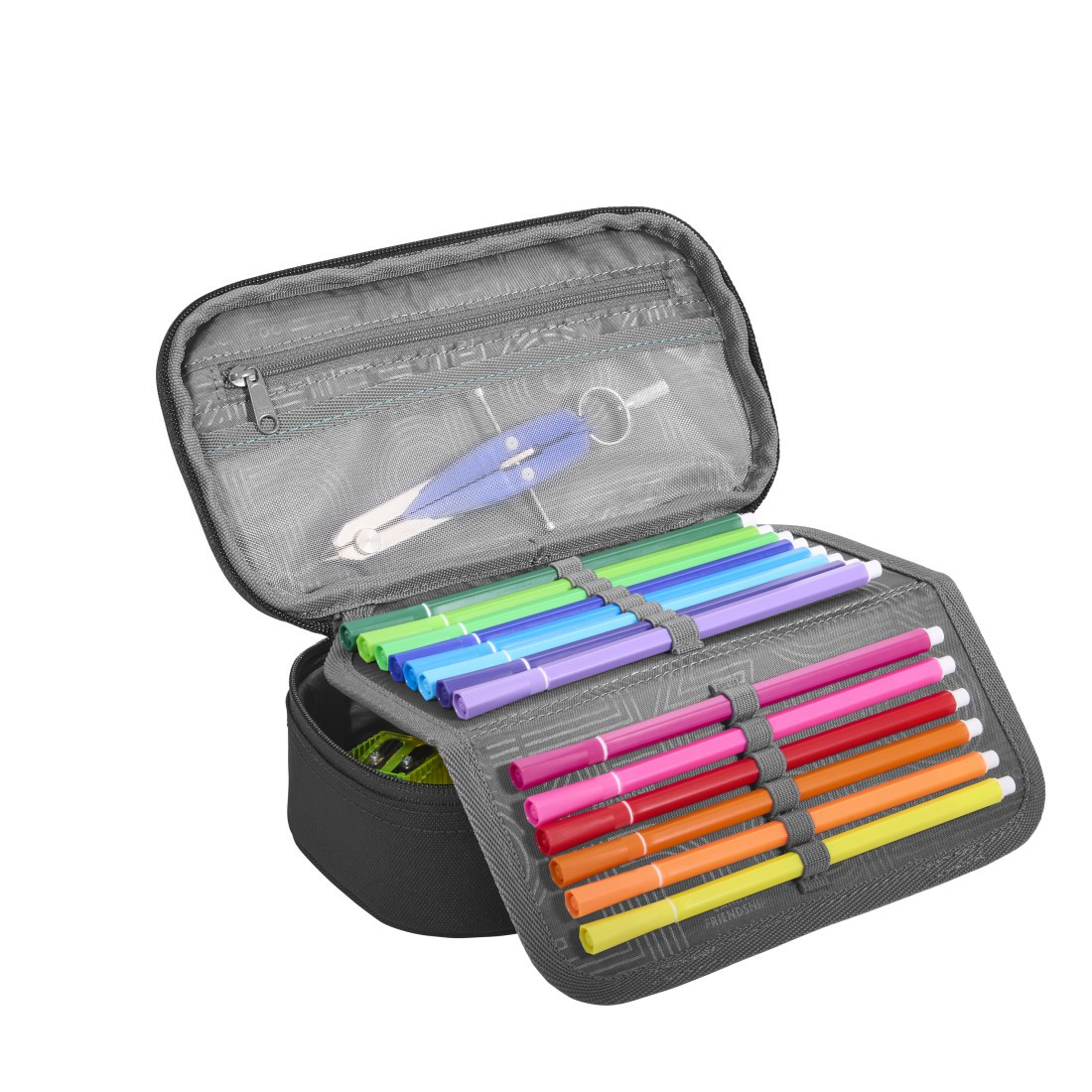 Prostorný penál pro uložení psacích potřeb, pravítek a dalších školních nebo osobních předmětů. Penál je uzavíratelný na zip. Uvnitř penálu najdete 21 poutek na pera a tužky pro přehledné upořádání.