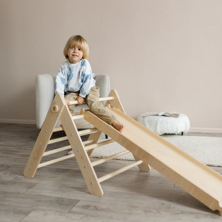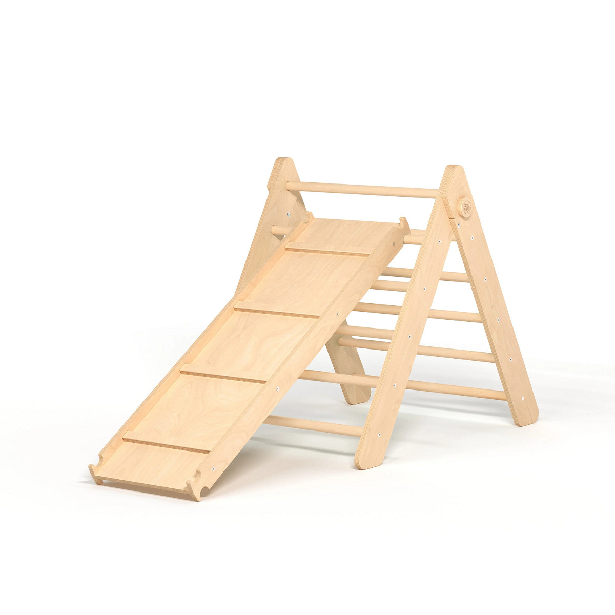 Praktická sada, zahrnuje piklerové trojúhelník pro rozvoj motoriky a oboustrannou desku o rorměru 115 x 34 cm. Všechny hrany jsou zaoblené, tyče pevně upevněny a trojúhelník obsahuje uzamykací zařízení proti pádu. Produkt je vhodný pro děti od 1 roku, dodává se rozebraný s pokyny a veškerým příslušenstvím k sestavení.