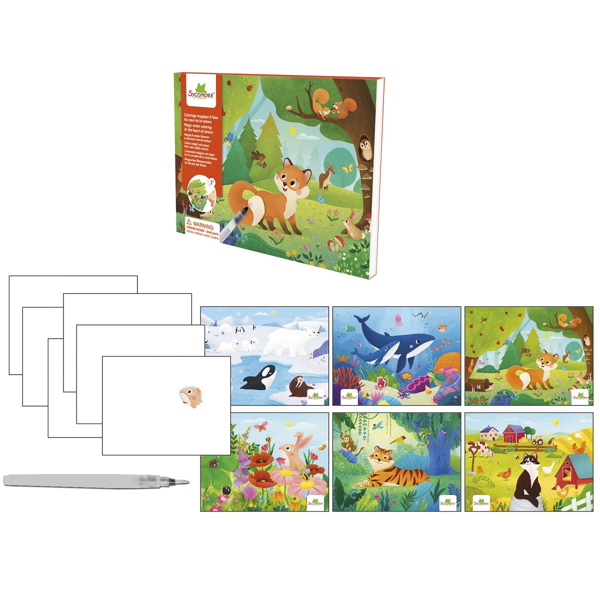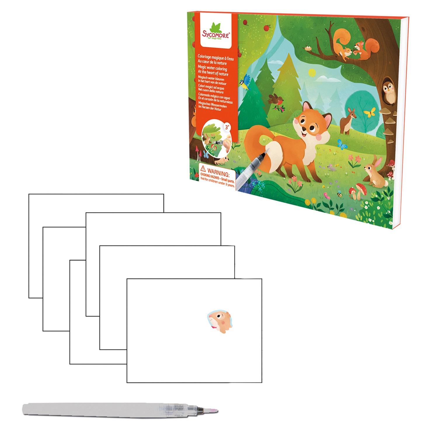 Zábavná a smyslová aktivita pro malé umělce od 3 let. Balení obsahuje 6 základů obrázků a kouzelný štětec na vodu. Stačí přetřít bílé plochy štětcem a jako zázrakem se objevují barvy. Částečný potisk přidává příjemný překvapivý efekt, což dělá tento kreativní zážitek ještě fascinujícím. Obrázky lze po uschnutí vybarvovat stále dokola. Děti se zabaví na delší dobu a výhodou je, že zůstanou čisté.
