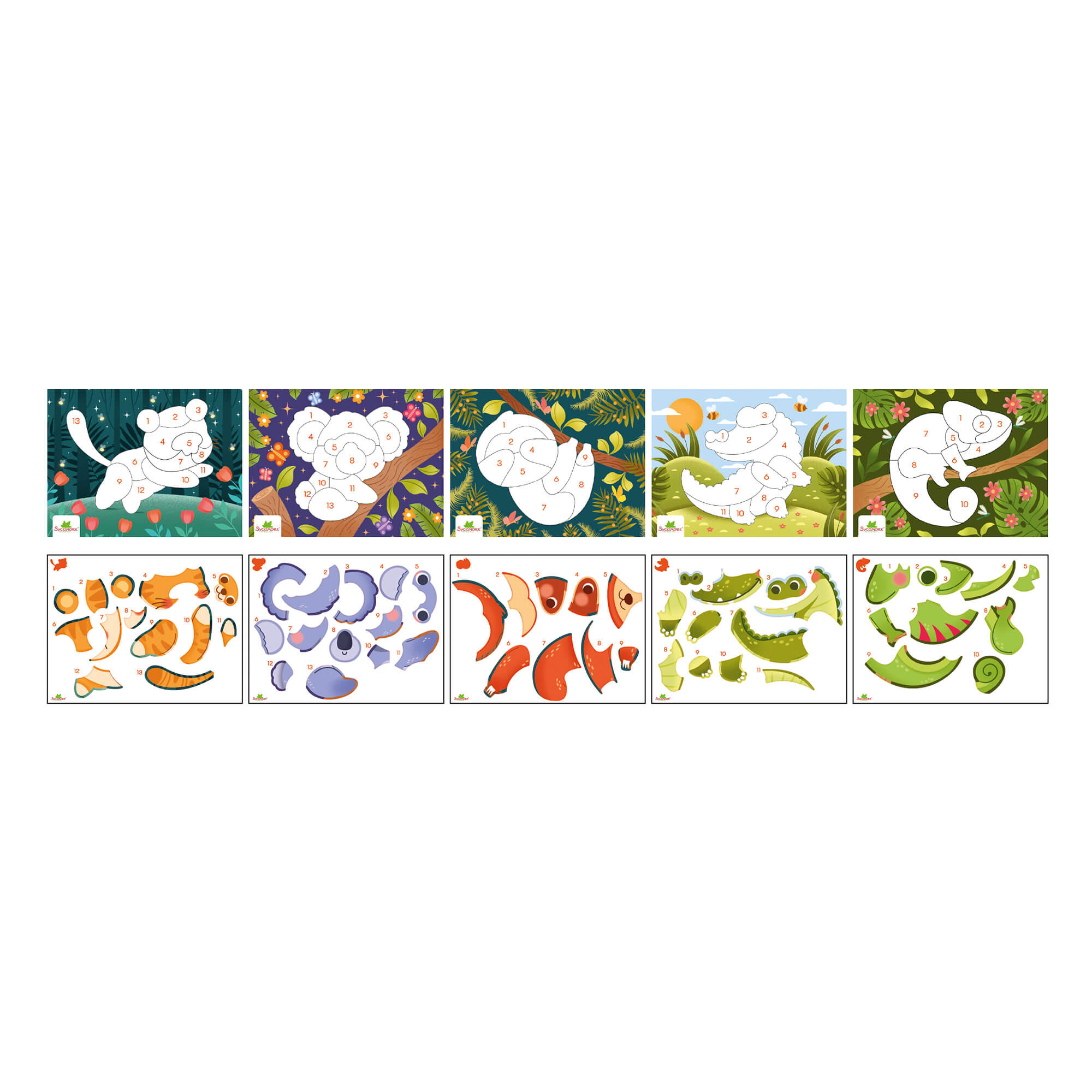 Tvoření se samolepkami pro děti od 5 let. Děti si nalepují očíslované samolepky na základy obrázků a postupně odhalují portréty zvířátek. Tato aktivita rozvíjí pozorovací schopnosti a jemnou motoriku. Samolepky jsou velké, snadno se s nimi manipuluje a lze je opakovaně přelepovat.