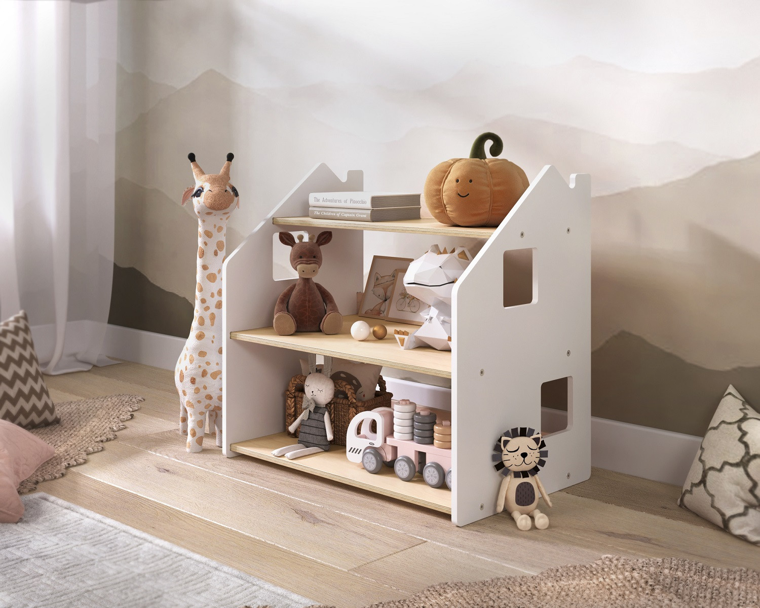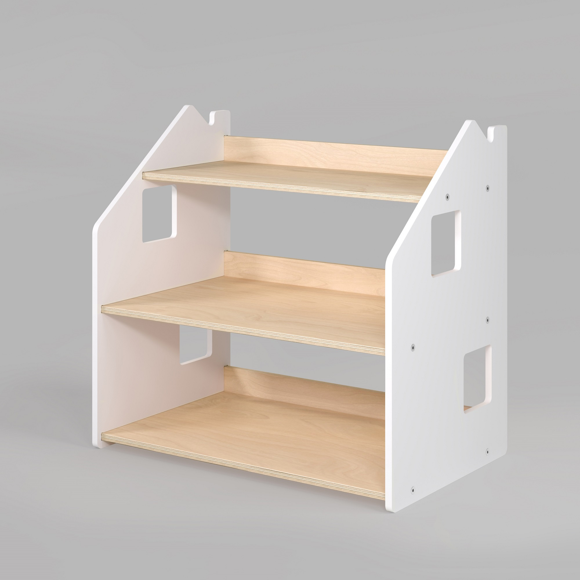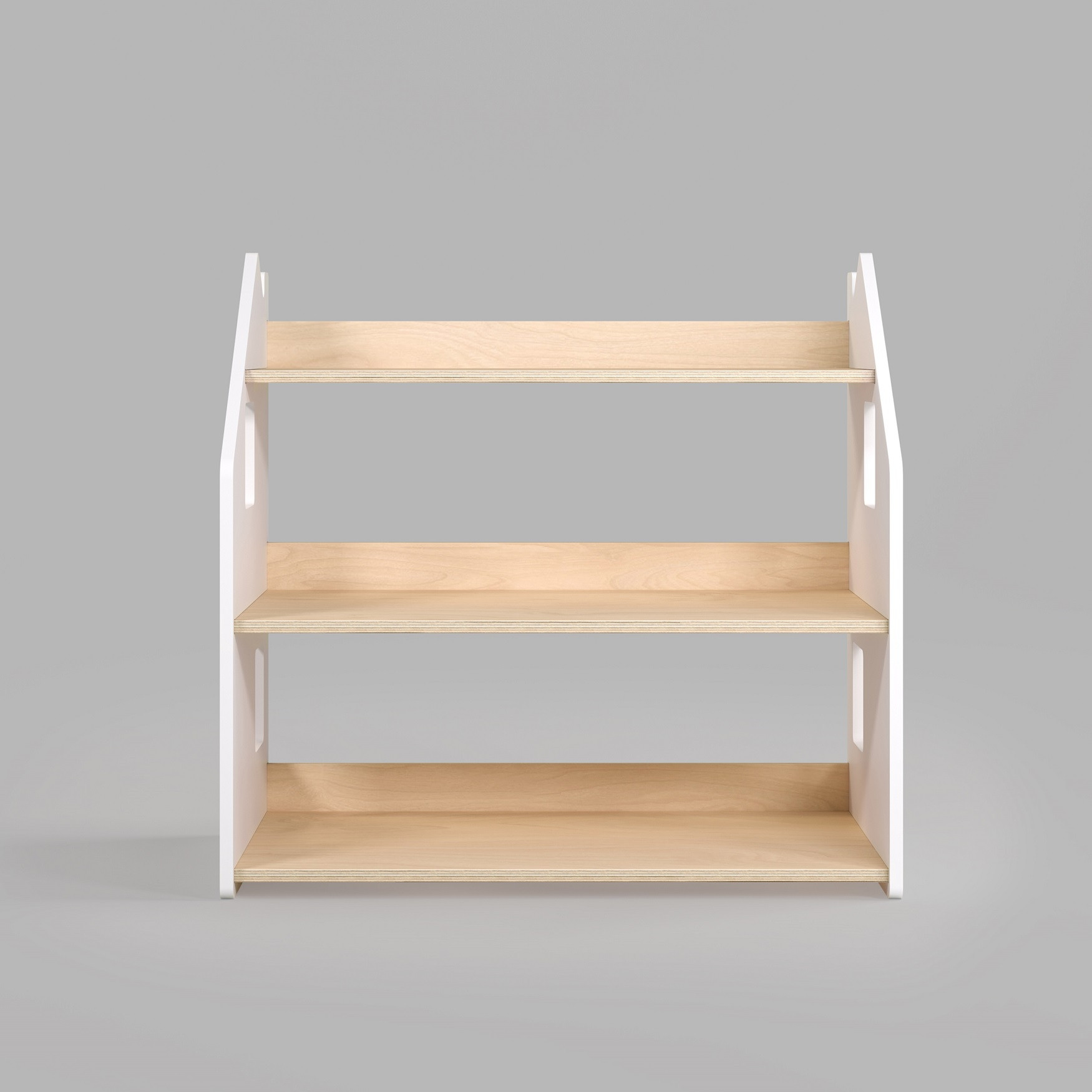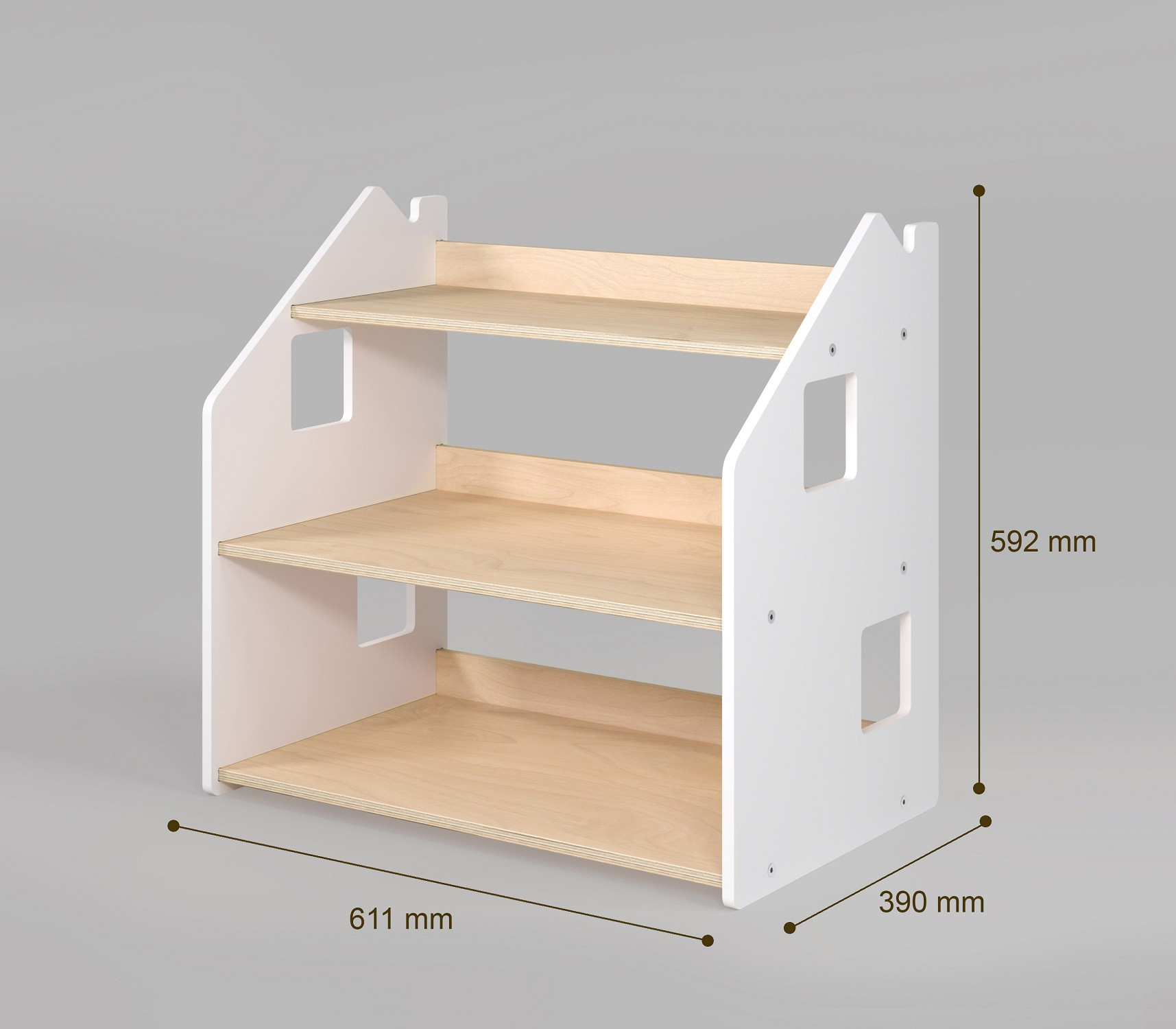 Prostorná knihovna se 4 policemi a zadním úložným prostorem na knihy či hračky. Děti si mohou samy odkládat a uklízet hračky, rozvíjí tím zodpovědnost a organizaci. Knihy jsou uloženy obálkami dopředu, což podporuje zájem o čtení. Navrženo podle principu Montessori „Pomoz mi, abych to udělal sám“ – děti si sami vybírají a ukládají své knihy, učí se samostatnosti, odpovědnosti a pořádku. Police má stabilní a bezpečnou konstrukci s lakem na vodní bázi, všechny hrany jsou zaoblené.