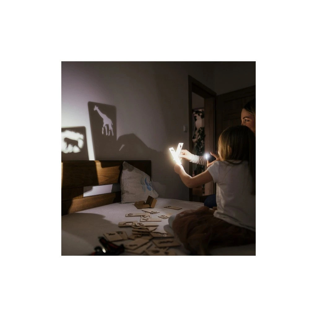 Ilustrace si můžete promítat na zeď, strop nebo jakoukoliv jinou světlou plochu, a to pomocí baterky, čelovky nebo i světla z mobilního telefonu (doporučujeme nepoužívat dvojitý blesk pro lepší kvalitu obrázků). Karty lze využít i pro zábavu za denního světla, a to jako šablony na obkreslování nebo formičky na vymačkávání tvarů z plastelíny. Nechte na vašich dětech, jak si se sadou vyhrají, možná vás překvapí, jaké způsoby využití ještě objeví.