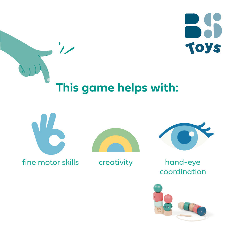 Sada různobarevných dřevěných korálků pro děti od 18 měsíců. Provlékání barevných korálků je skvělý způsob, jak procvičit koordinaci ruka-oko a jemnou motoriku. Korálky a kostky jsou extra velké a snadno se s nimi malým dětem manipuluje.