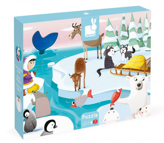 Krásné hmatové puzzle pro malé děti od 3 let znázorňují život na ledové kře. Děti se při skládání naučí poznávat zvířátka a obyvatele polární oblasti. Zároveň se učí poznávat zvířátka i hmatem. Puzzle rozvíjí logické myšlení, pozornost, paměť, jemnou motoriku. Při skládání se děti učí chápat vztah mezi částí a celkem. Složený obrázek má obdélníkový rozměr 65 x 50 cm.