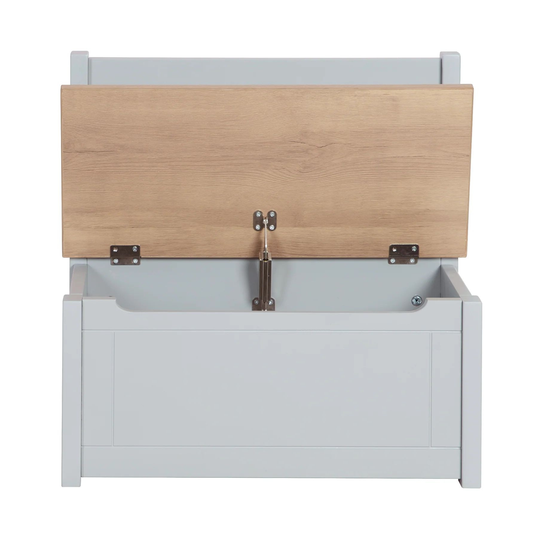 Sedák má povrch s melaminovým povlakem a imitací dřeva, což lavici činí odolnou a snadno udržovatelnou. Víko je vybaveno bezpečnostní brzdou, která zabraňuje nechtěnému přivření prstů. Malý výklenek v přední části umožňuje snadné a bezproblémové otevírání truhly.