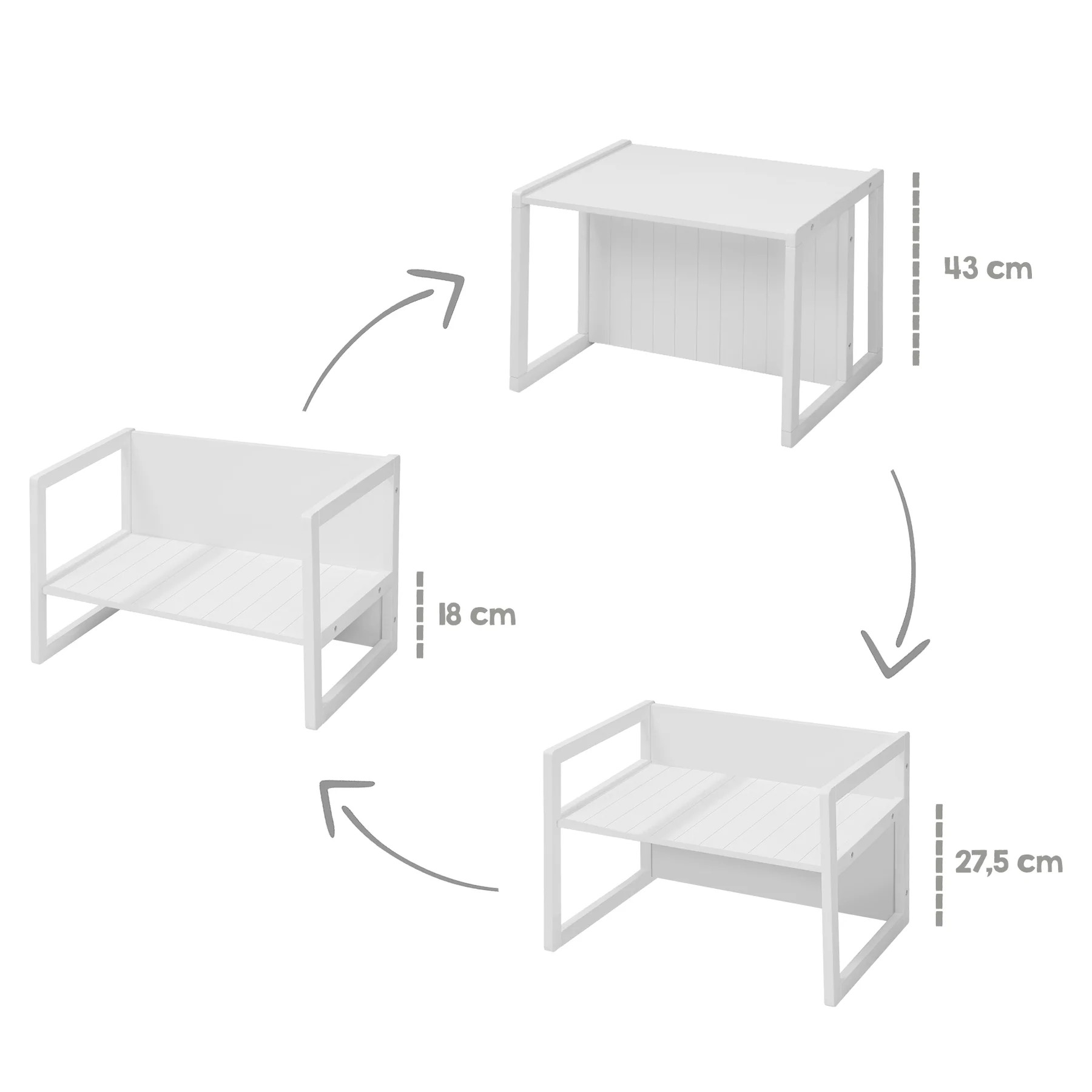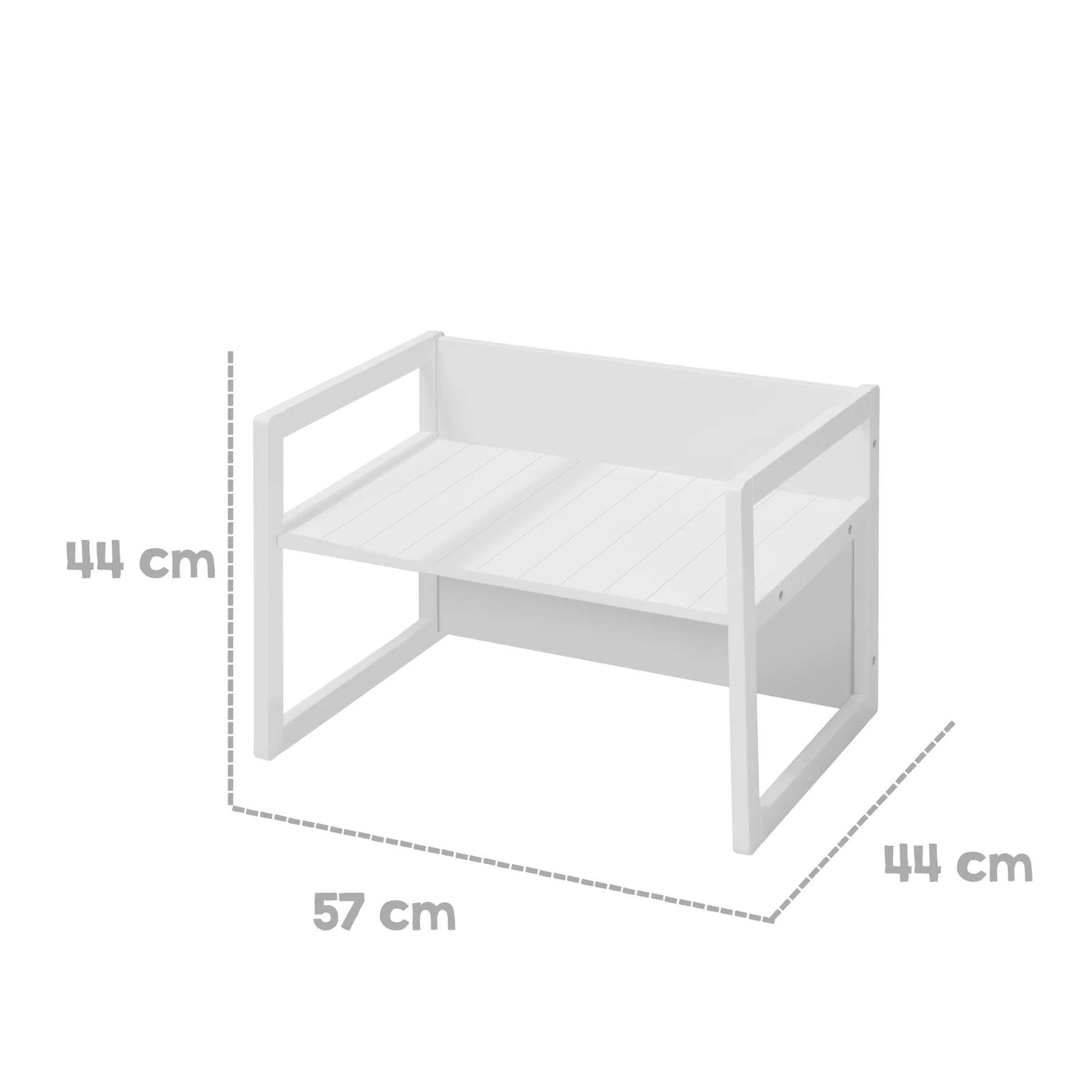 Multifunkční lavice a stůl 2 v 1 se skvěle hodí jak na sezení, tak jako stůl na hraní nebo tvoření. Stačí ji jednoduše otočit a proměníte ji na funkční stůl. Lavice nabízí dvě možnosti výšky sedáku (18 cm nebo 27,5 cm), což zajišťuje její přizpůsobivost pro různé věkové skupiny. Lavice je vyrobená z kvalitního dřeva v bílé barvě a zdobena jemným frézováním ve venkovském stylu. Povrchová úprava zajišťuje snadnou údržbu.