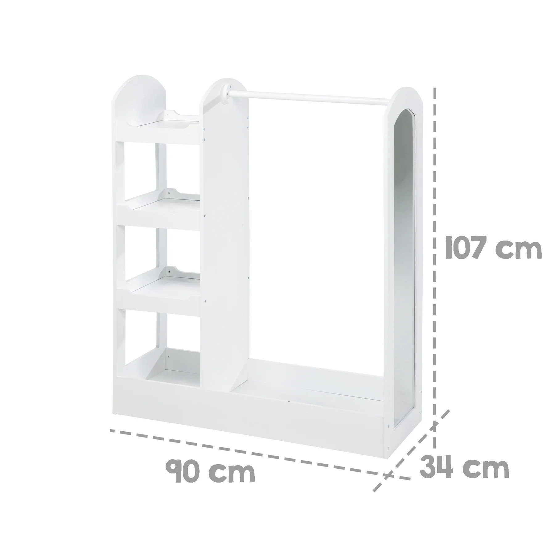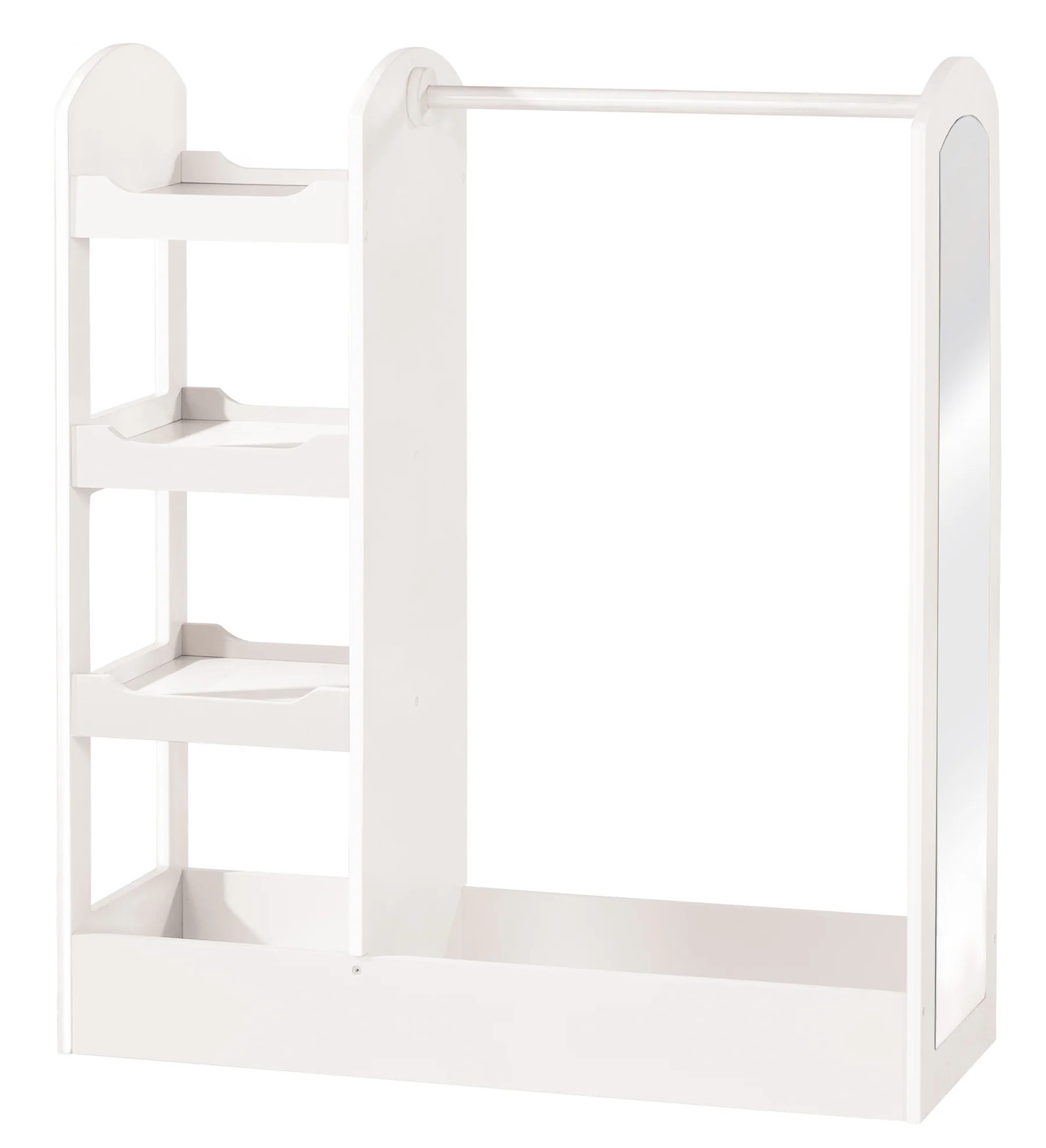 Vnitřní prostor nabízí čtyři police pro přehledné uspořádání oblečení, hraček nebo doplňků. Spodní větší police je ideální například na boty nebo objemnější věci. Součástí skříně je také zrcadlo, které dětem umožní zkontrolovat svůj outfit.