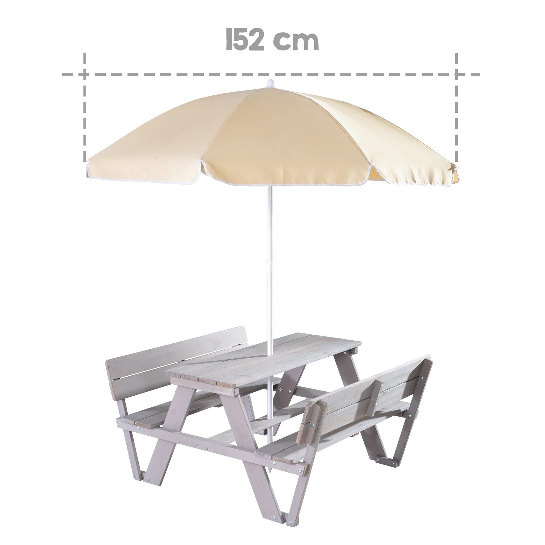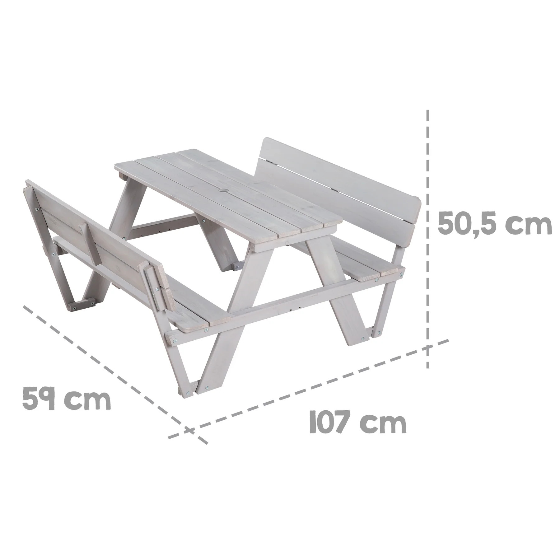 Dětská venkovní sedací souprava s opěradly je ideální pro děti od 12 měsíců a poskytuje místo až pro 4 děti. Je vyrobená z kvalitního masivního dřeva, robustní, odolná vůči povětrnostním vlivům a ošetřená šedou lazurou. Sedací soupravu využijí děti na pikniky, malování, tvoření a hraní na zahradě nebo na terase. Součástí této sedací soupravy je také slunečník, který ochrání děti před slunečním zářením za horkých letních dnů. Uprostřed desky stolu je malý otvor, kterým lze slunečník snadno připevnit.