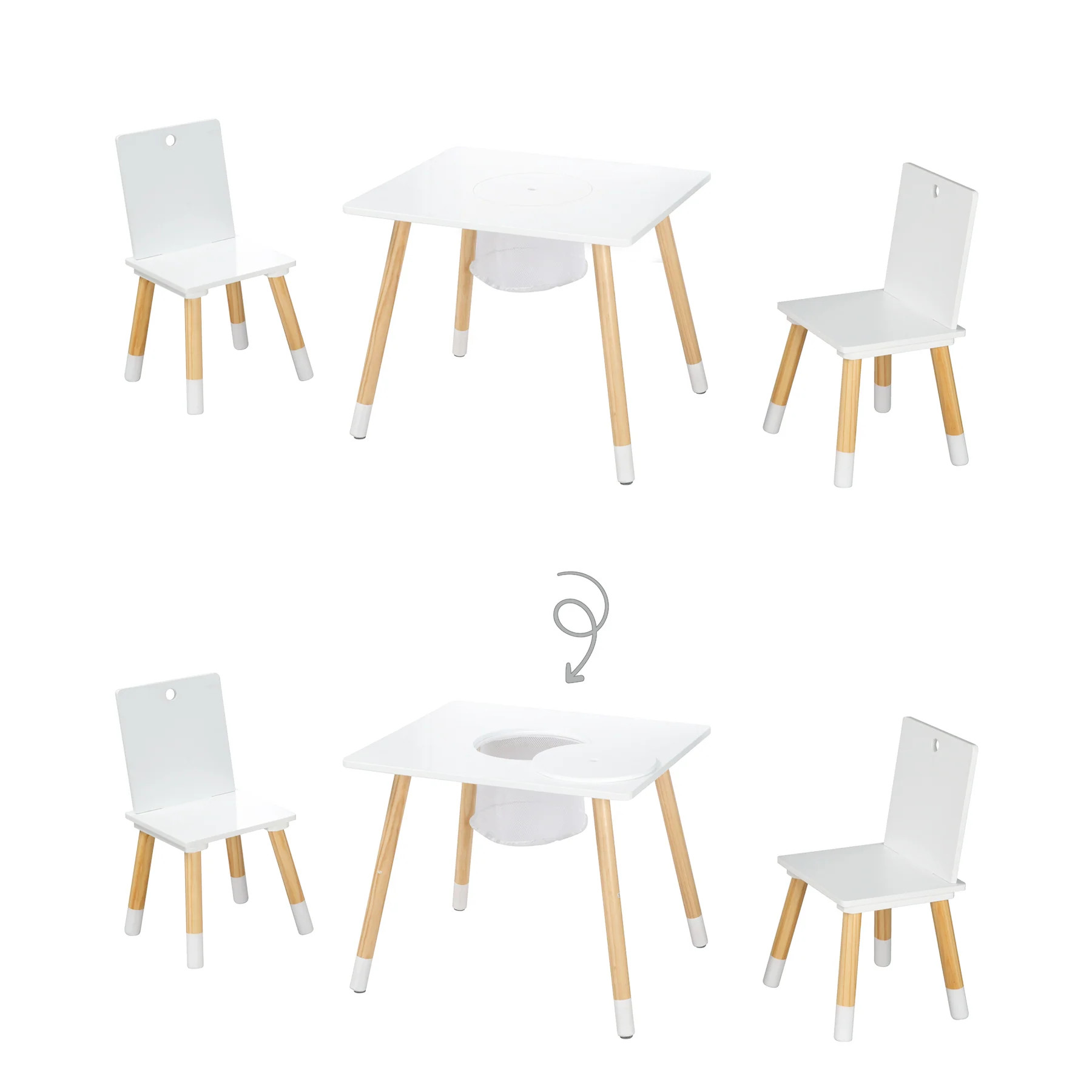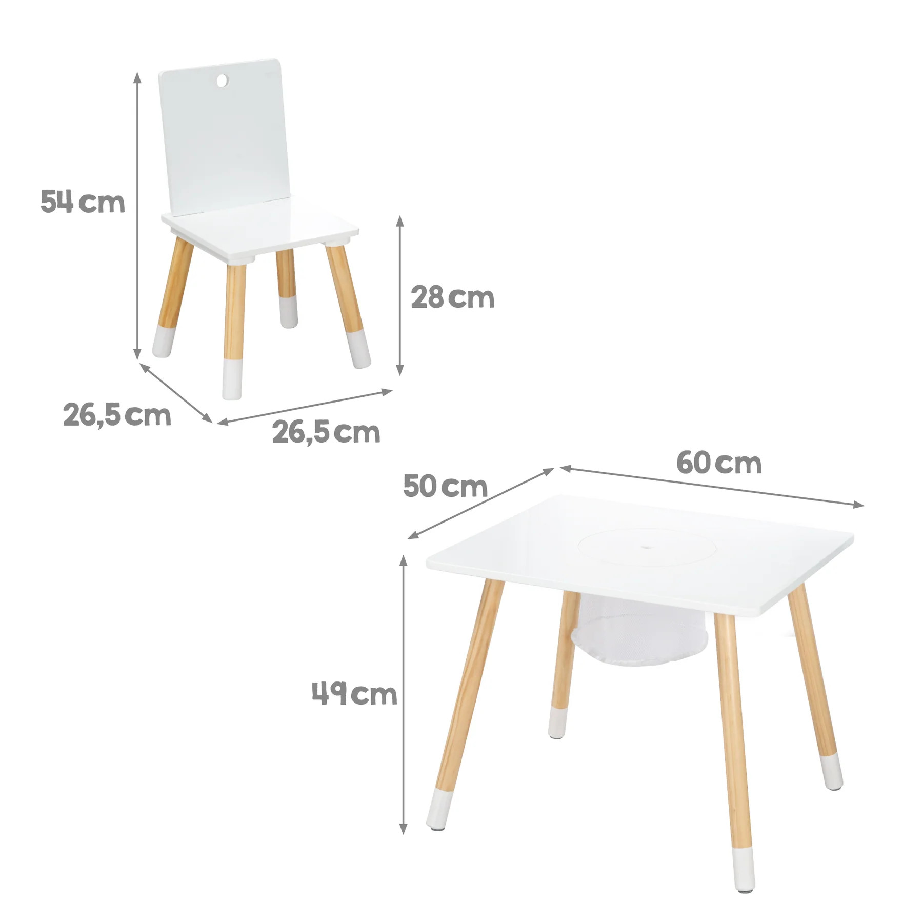 Tato třídílná dětská sedací souprava je ideálním řešením pro děti ve věku od 1,5 do 10 let. Je vyrobena z lakované MDF desky v kombinaci s masivním dřevem. Skládá se z dětského stolu s úložnou sítí a dvou odpovídajících židlí. Na židlích si děti mohou pohodlně sednout a u stolu si hrát, jíst nebo tvořit. Tento nábytek poskytuje ideální místo pro kreativní a zábavné chvíle.