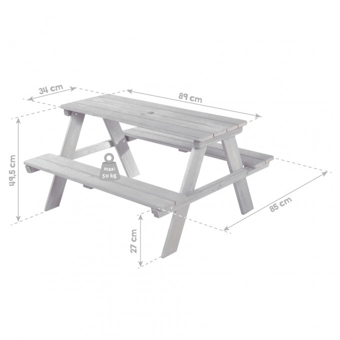 Dětská pikniková sedací souprava v šedé barvě je odolná vůči povětrnostním vlivům a kvalitně vyrobená. Sedací sestava z masivního dřeva poskytuje místo pro 4 děti od 12 měsíců. Zaoblené rohy hracího stolu a robustní konstrukce zajišťují optimální bezpečnost.