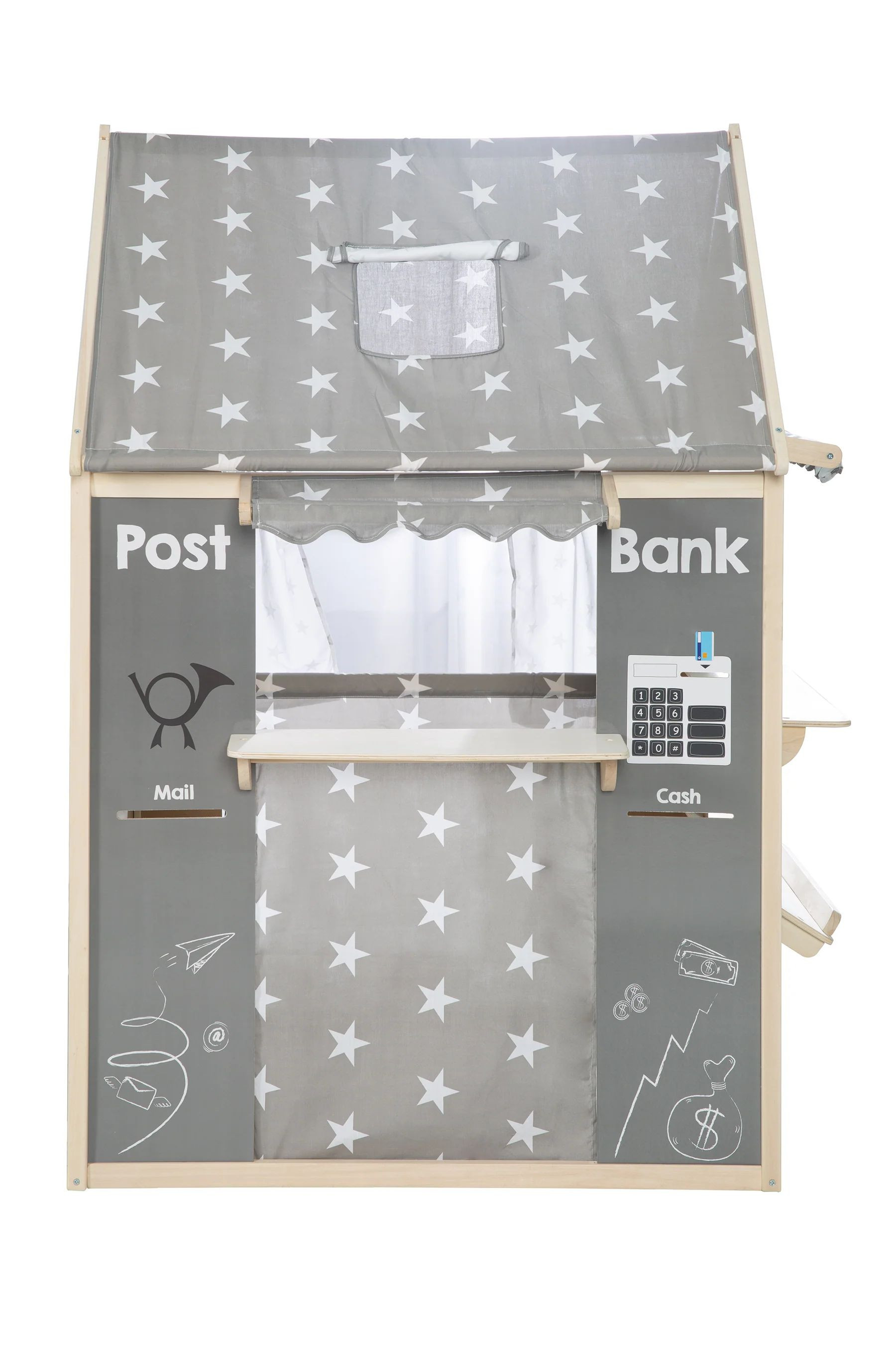 Dětský domeček na hraní nabízí úžasný svět plný dobrodružství, s nespočtem možností ke hře. Tento plně vybavený domeček lze využít jako obchůdek s pultem a hodinami, poštu, kiosek nebo banku, a dokonce i jako loutkové divadlo s oponou a vyměnitelnou kulisou. Jedna strana s velkou tabulí a látkovými dveřmi pak herní možnosti domečku skvěle doplňuje. Podporuje kreativitu i sociální interakci a je ideální volbou pro všechny děti od 3 let.