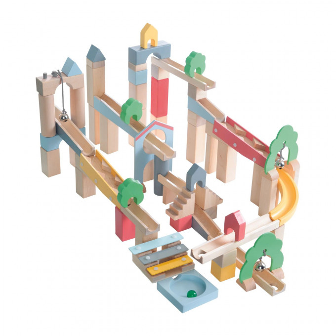 Tato kvalitní dřevěná kuličková dráha je všestranná a nápaditá hračka, která byla speciálně navržena pro děti od 3 let k podpoře jejich motorických dovedností. Sada se skládá celkem z 60 dřevěných stavebních dílů a 20dílného rozšiřujícího setu, což umožňuje vytvářet rozmanité a nápadité krajiny pro jízdu kuliček. Součástí této krajinné stavebnice jsou doplňky jako keříky se zvonky, tunely, kuličková zatáčka, domečky a stromy. Děti mohou opakovaně vytvářet nové cesty a dráhy, čímž rozvíjejí své plánování, prostorové myšlení a fantazii.