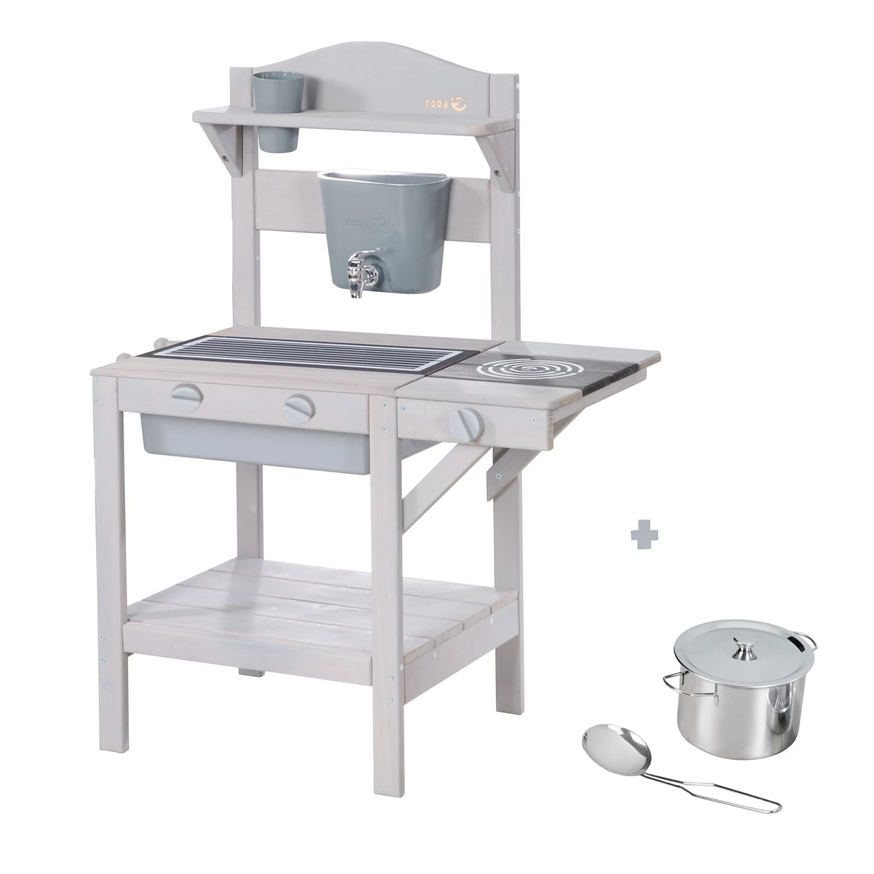 Kuchyňka je vybavena bohatým příslušenstvím, které podporuje nápaditou hru. Nechybí odnímatelná varná deska, hrnec s poklicí a obracečka, tři otočné knoflíky, vyjímatelná vanička, nádoba na vodu s kohoutkem, hrnek ani dva háčky na zavěšení kuchyňského náčiní. Praktický úložný prostor navíc umožňuje mít vše přehledně po ruce.