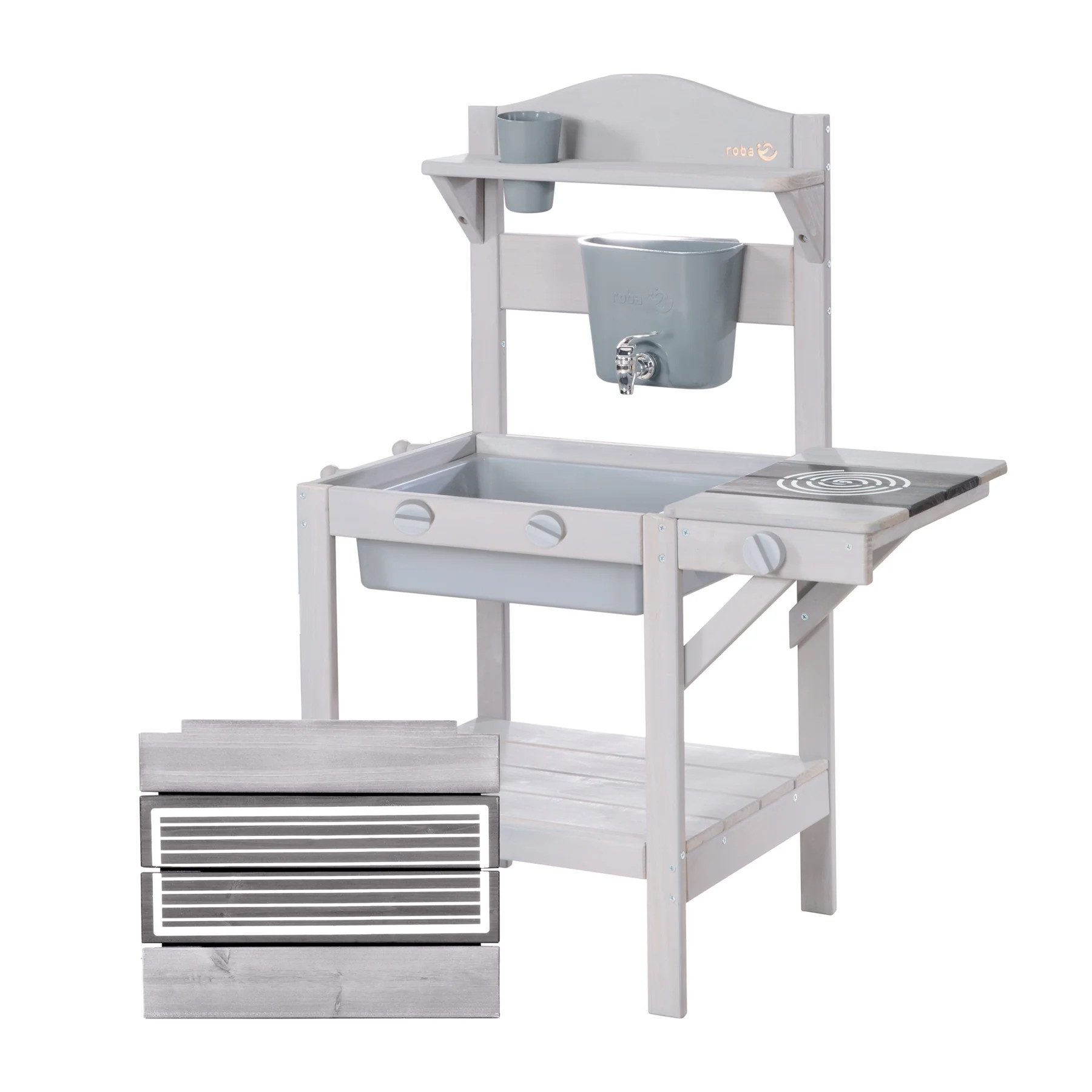Stabilní konstrukce z masivního dřeva, pocházejícího z udržitelných zdrojů, zajišťuje dlouhou životnost a odolnost při venkovním používání. Dřevo je ošetřeno ochranným mořidlem, díky tomu kuchyňka odolává povětrnostním vlivům. Zaoblené hrany a rohy přispívají k bezpečnému hraní i pro menší děti.