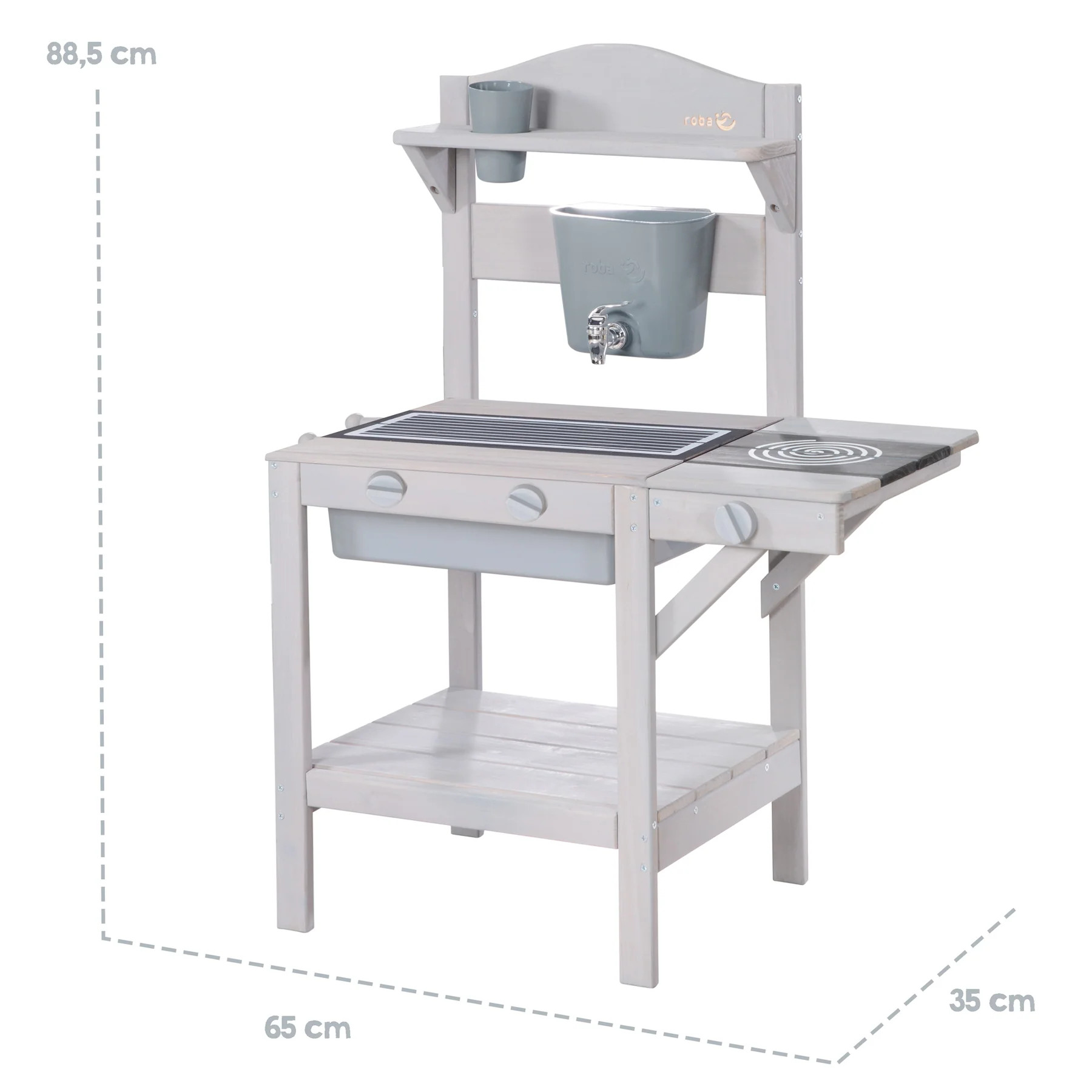 Venkovní kuchyňka v šedém provedení se skvěle hodí na zahradu, terasu nebo balkon. Je vhodná pro děti od 18 měsíců a lze ji využívat jak venku, tak i v interiéru. Díky realistickým prvkům si děti mohou hrát na vaření, objevovat nové role a užívat si společné chvíle s kamarády.