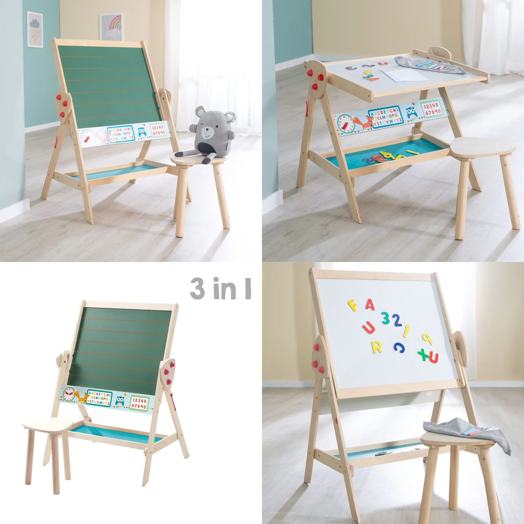 Tato oboustranná tabule se stoličkou zve budoucí školáky k hravému učení čtení, psaní a kreslení. Tabule s bílou magnetickou stranou nabízí dostatek prostoru pro kreativní tvorbu, a pro hravé učení je tabule vybavena hodinami s pohyblivými ručičkami a krásně zpracovanou natištěnou abecedou.