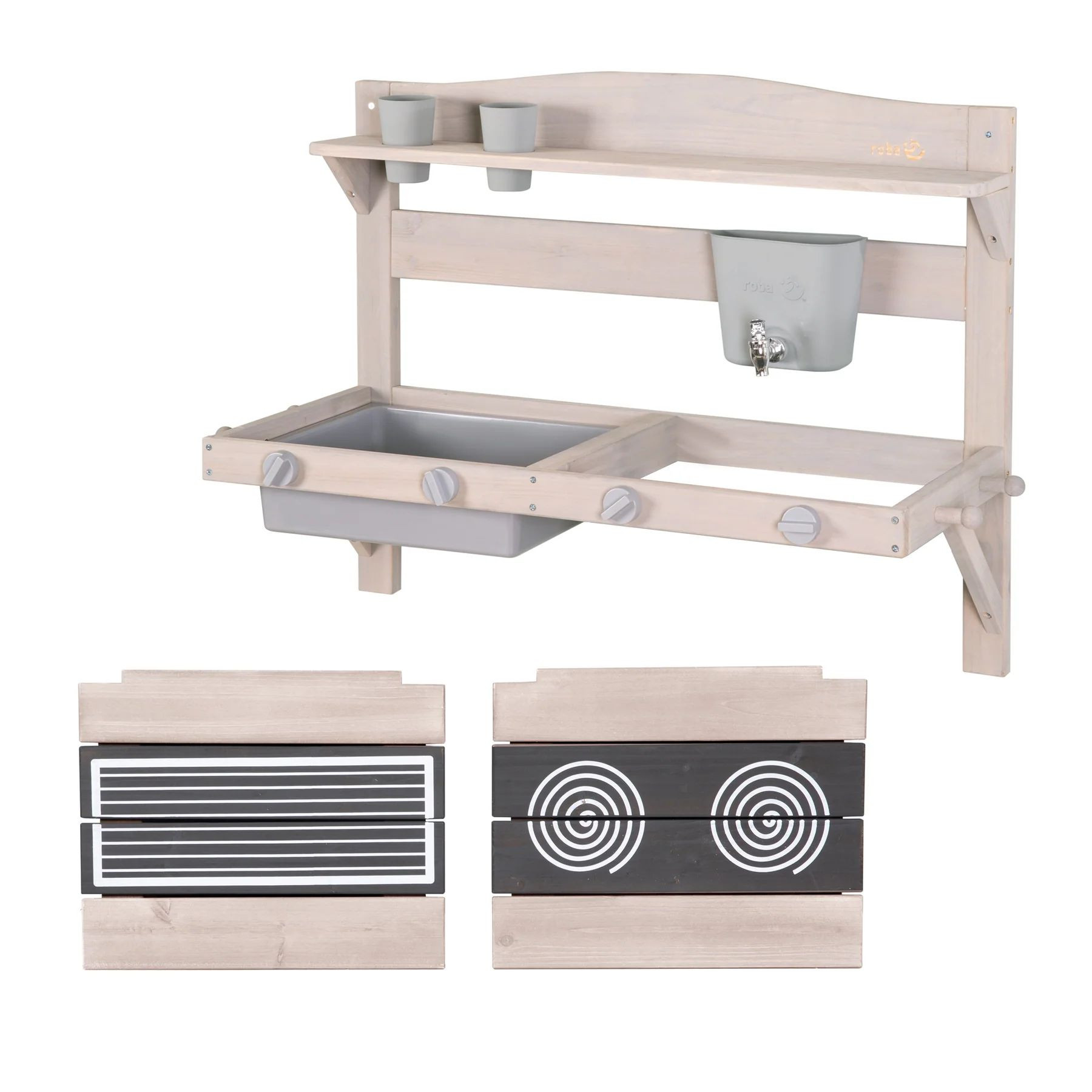 Kuchyňka je vyrobena z masivního dřeva pocházejícího z udržitelných zdrojů a ošetřena mořidlem odolným vůči povětrnostním vlivům. Pevná konstrukce zajišťuje stabilitu, dlouhou životnost a bezpečné hraní. Plastové hrací umyvadlo a doplňky jsou odolné a snadno se udržují.