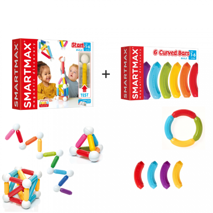 Tato belgická magnetická stavebnice představuje ideální hračku pro malé děti od 1 roku. Balení Start obsahuje 3 velké tyčky (dlouhé 12cm), 12 středních tyček a 8 spojovacích koulí, v sadě jsou doplněné o 6 zatáček. Přitahování a odpuzování magnetů ohromí děti na jejich cestě za poznáním. Malé děti vytvoří jednoduché 2D tvary. Starší děti mohou budovat věže, mosty a další super velké stavby. Jednotlivé magnetické díly se jednoduše spojují jedním kliknutím. Všechny díly lze kombinovat se všemi stavebnicemi Smartmax. Součástí balení je i brožurka s ukázkami, co všechno lze z této sady postavit.