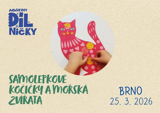 Zveme vás do Agátiny kreativní dílničky. Přijďte si s námi vytvořit dva originální obrázky pomocí samolepek. Na děti čeká roztomilá kočička obrázek mořského zvířátka. Oba obrázky si děti vyzdobí buď podle předlohy, nebo dle vlastní fantazie. Děti si procvičí jemnou motoriku, trpělivost a smysl pro detail. Vytvořené výrobky si děti odnesou s sebou domů.