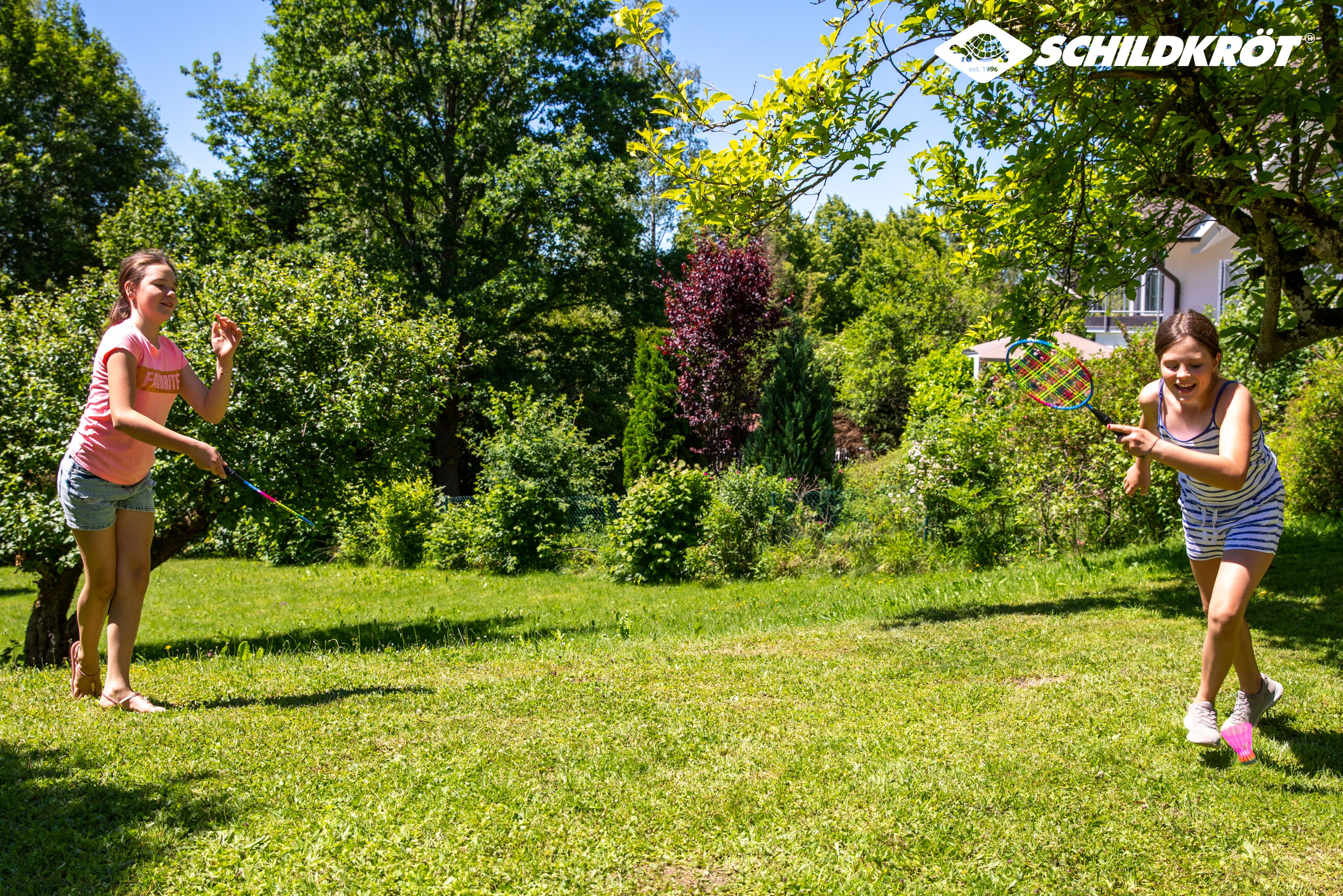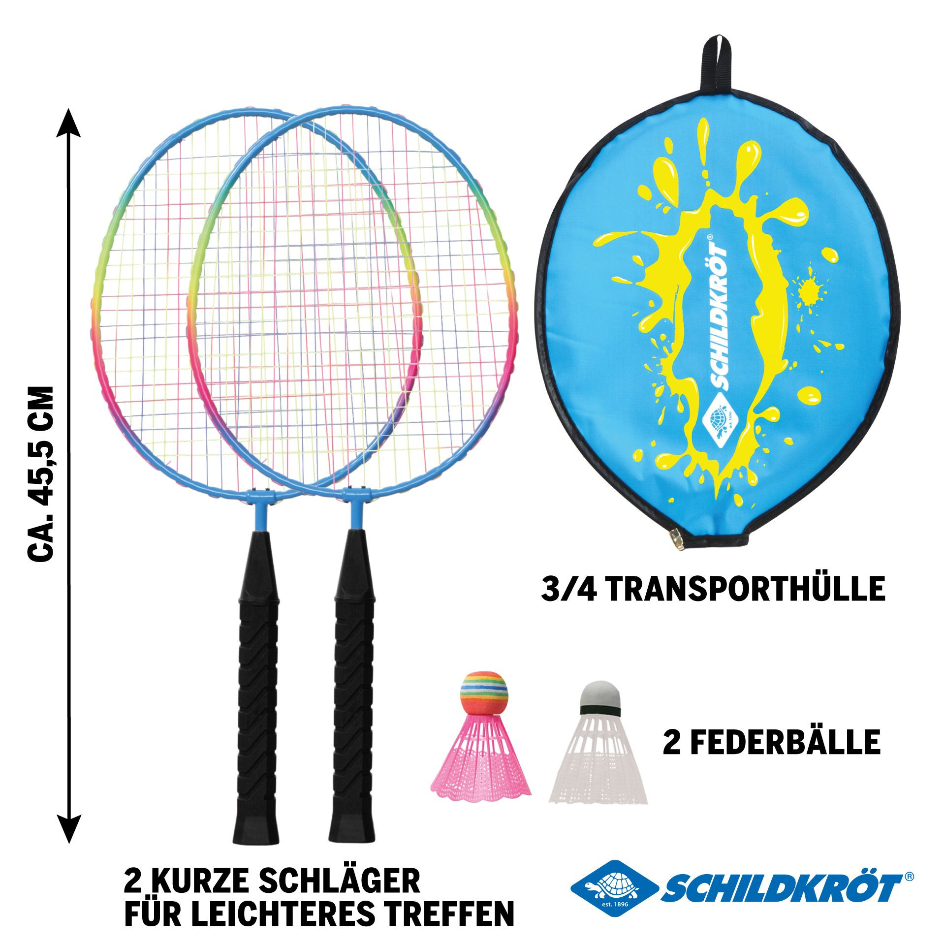Dětská badmintonová sada pro 2 hráče v rekreační kvalitě, včetně 2 raket (45,5 cm) z kalené oceli se svařovaným T-spojem, očky na uchycení, odolným a pevným výpletem, robustními plastovými rukojeťmi a 2 pérkami. Všechny položky jsou dodávány v praktickém 3/4 obalu s potiskem loga Schildkröt a zipem.