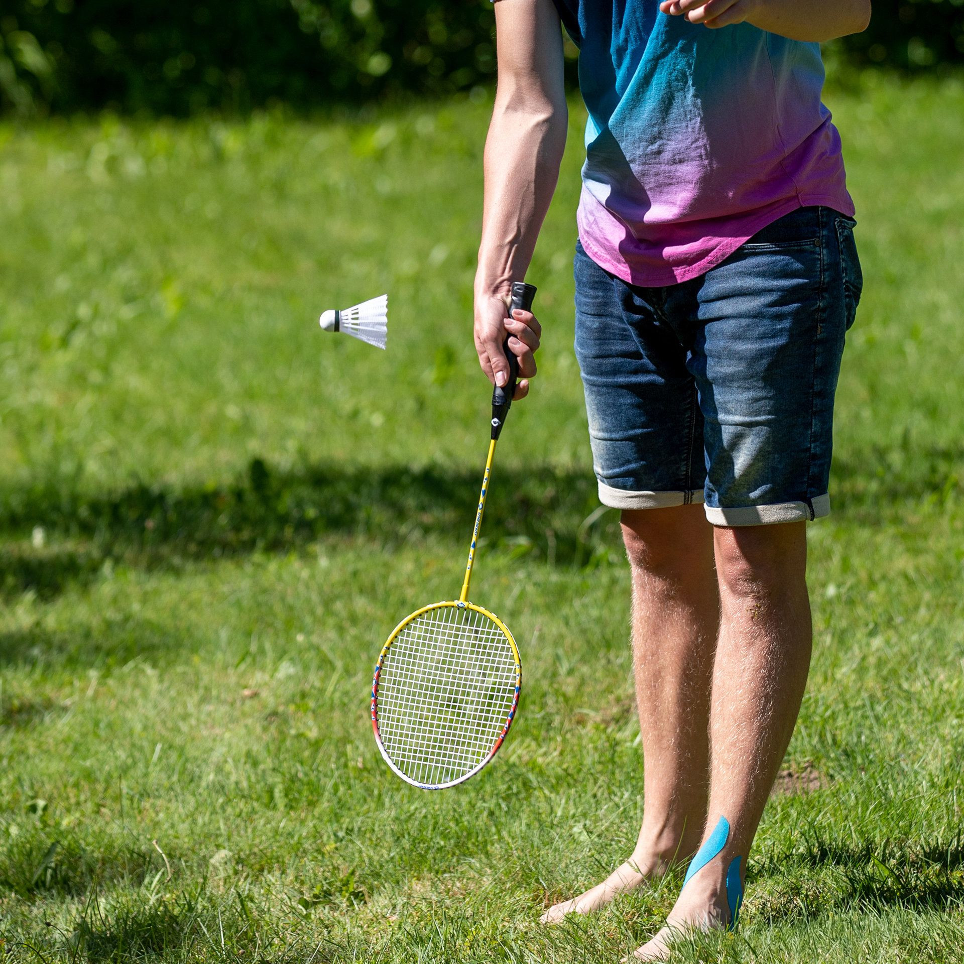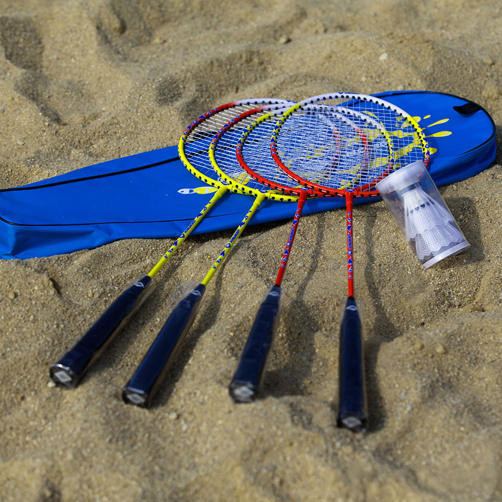 Badmintonová sada pro 4 hráče v dobré rekreační kvalitě, včetně 4 raket z kalené oceli se svařovaným T-spojem – bez ohýbání, s dvojitými očky pro ochranu výpletu, odolným a pevným výpletem, který zabraňuje zaseknutí míčku. Součástí balení jsou 2 plastové míčky s korkovou základnou, balené v plechovce pro zachování tvaru – míčky se nedeformují. Všechny položky jsou uloženy v praktickém, vysoce kvalitním nylonovém sáčku s potiskem loga Schildkröt, zipem a popruhem pro nošení.
