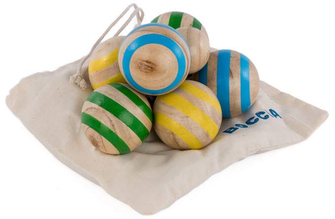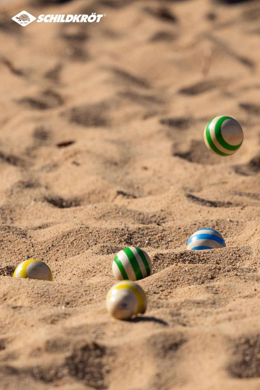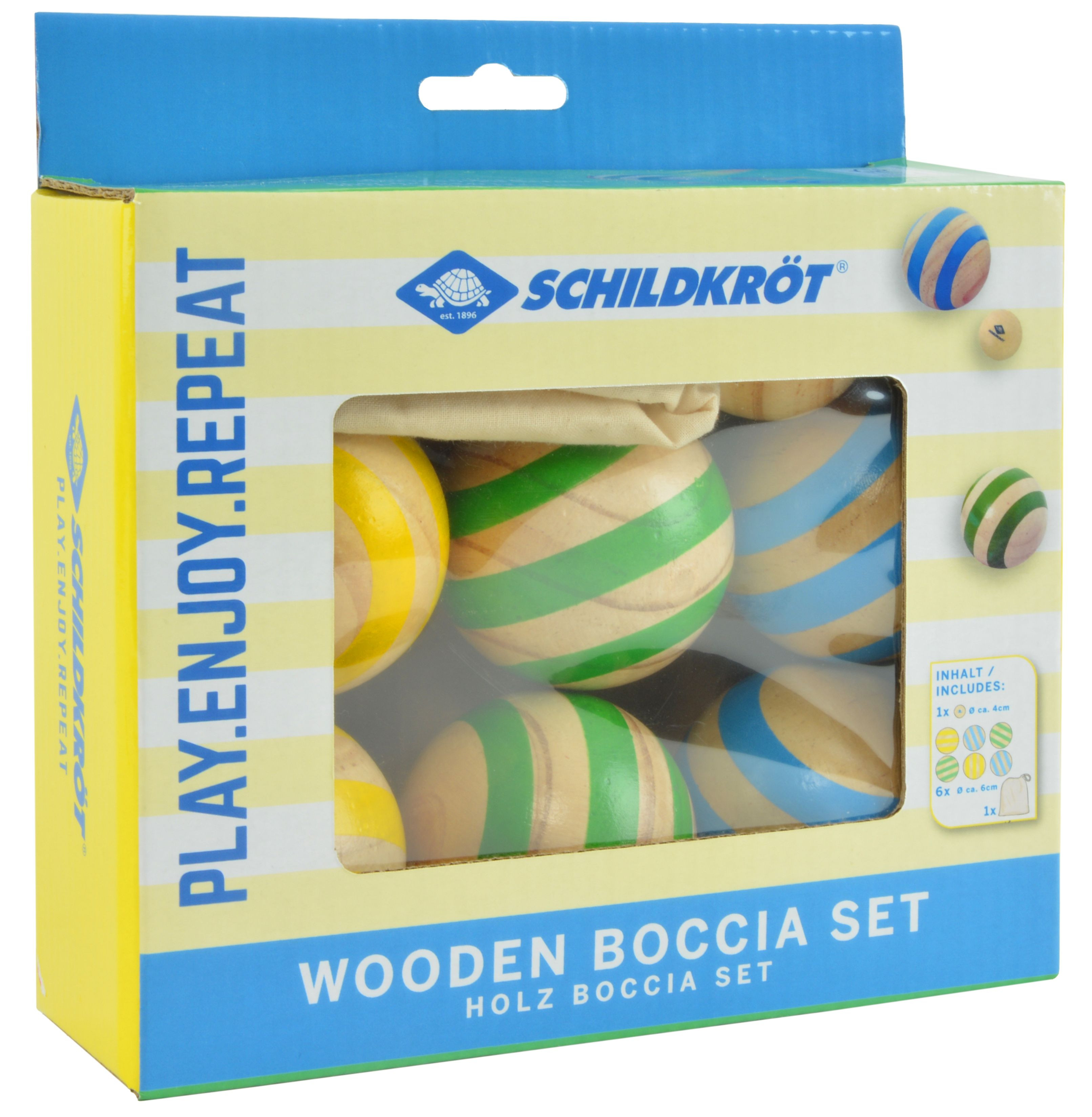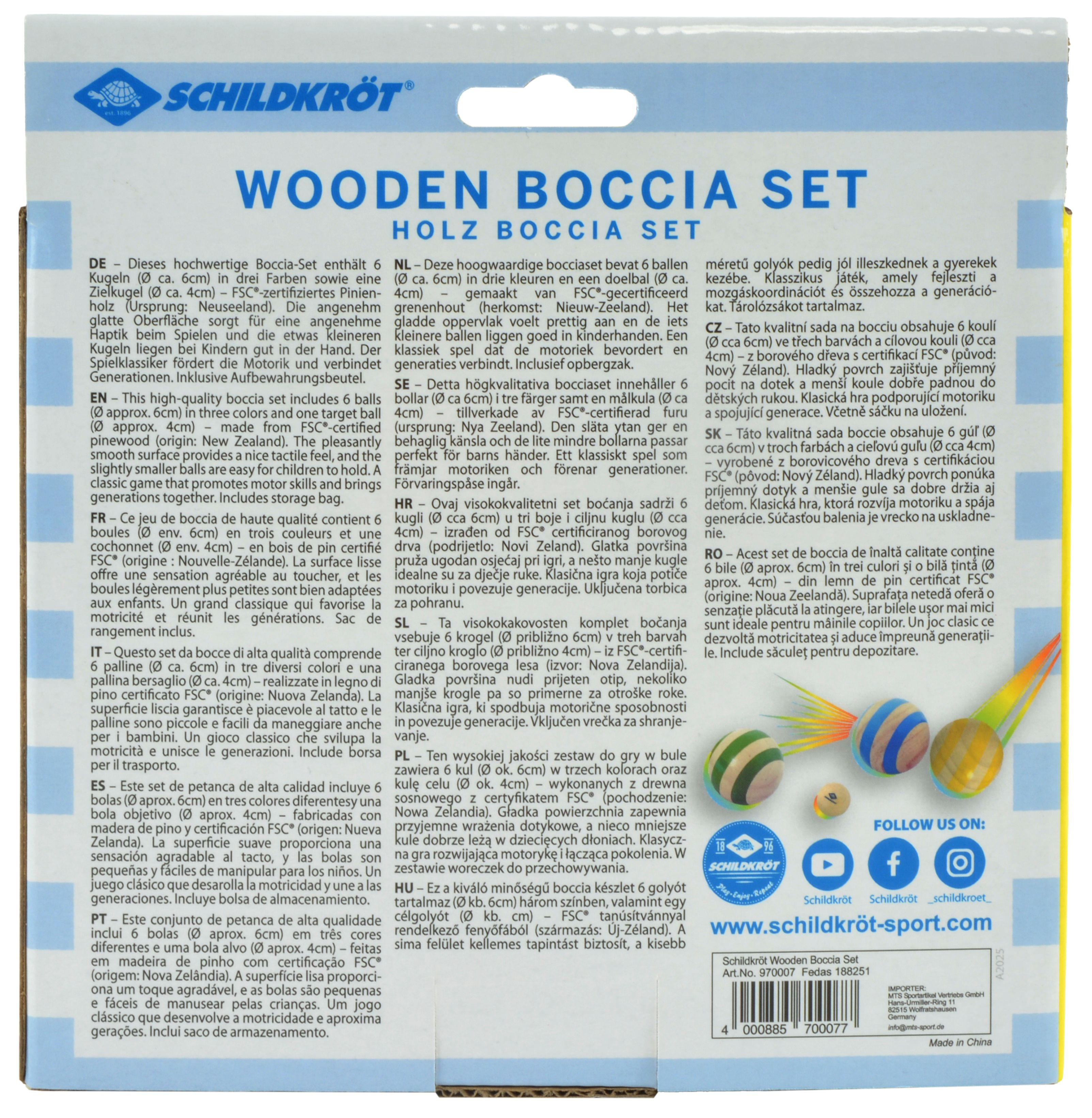 Sada Schildkröt Boccia vyrobená z borovicového dřeva z odpovědně obhospodařovaných zdrojů je perfektní klasickou venkovní hrou pro celou rodinu. Obsahuje 6 barevných míčků (Ø 6 cm) ve třech barvách a jeden terčový míček (Ø 4 cm). Hra je ideální pro napínavé soutěžní výzvy na zahradě, v parku nebo na pláži. Díky hladkému povrchu a pohodlné velikosti se s míčky obzvláště snadno manipuluje a to i dětem.