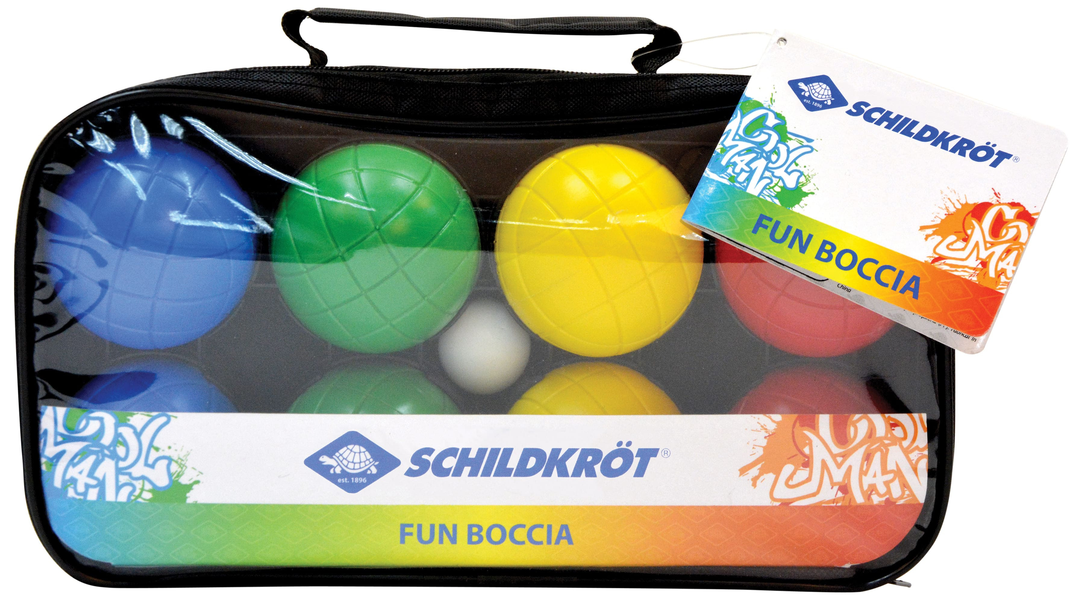 Součástí je také malá cílová koule (prasátko) a praktická nylonová taška s průhlednou přední stranou, zipem a držadlem. Díky ní zůstává sada vždy čistá, přehledná a připravená k použití.