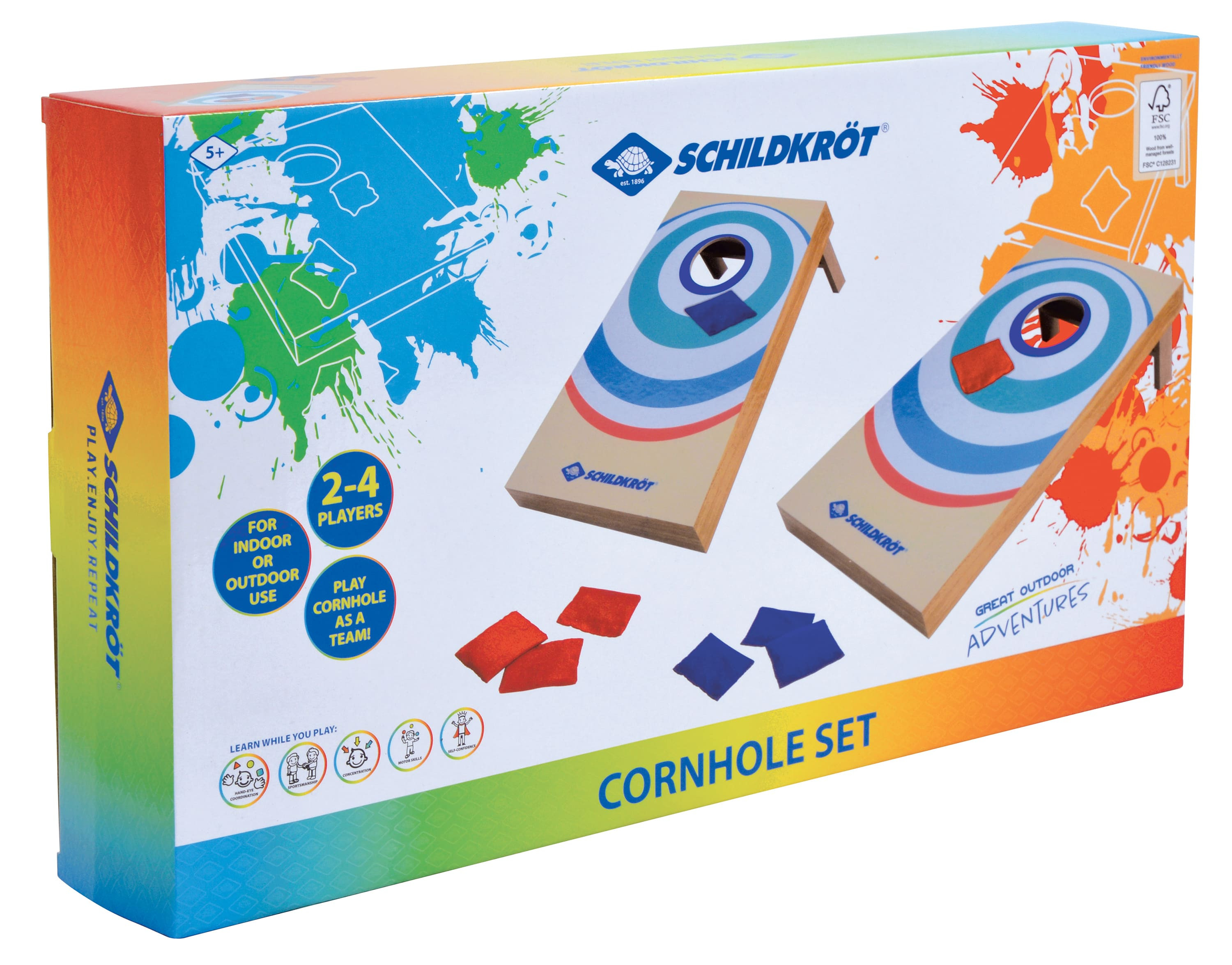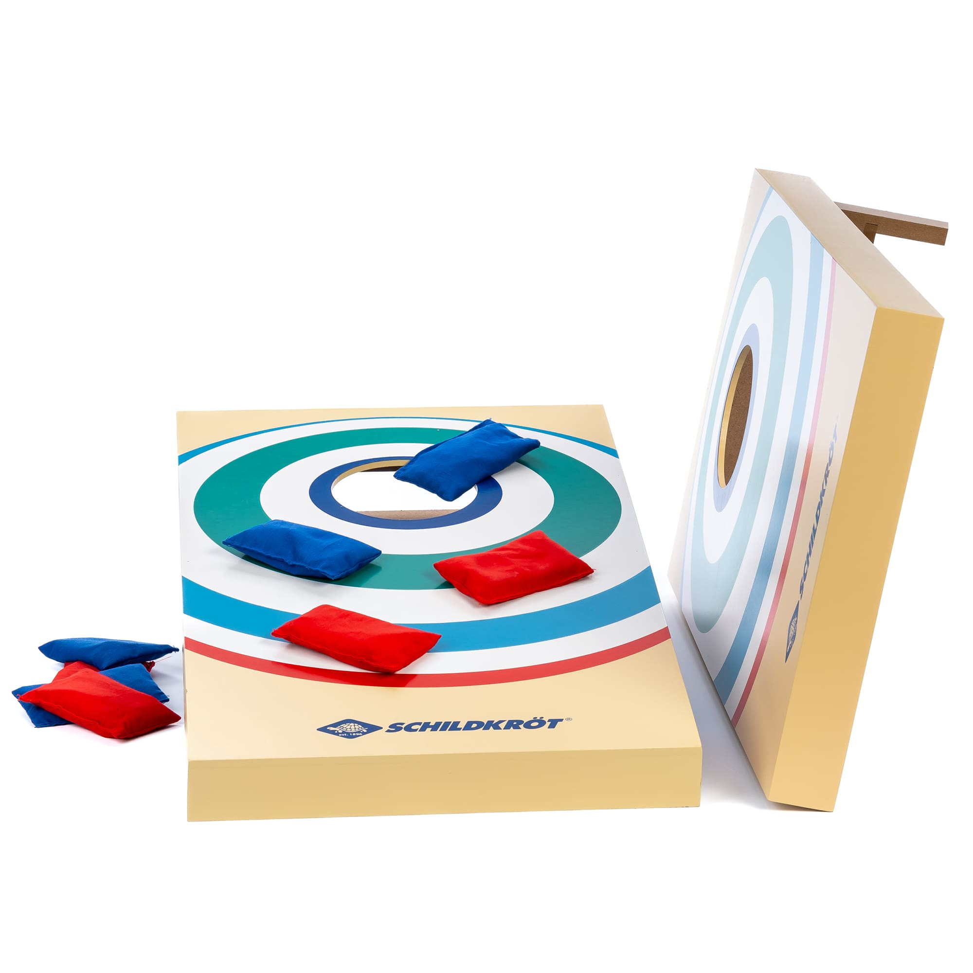 Sada Schildkröt Cornhole je zábavná volnočasová hra pro 2–4 hráče, která vyžaduje zručnost a dobrou mušku. V této americké oblíbené hře je třeba hodit 4 červené a 4 modré pytlíky s pískem do otvoru ve dvou šikmých částech cílové desky (52 x 30 x 14 cm).