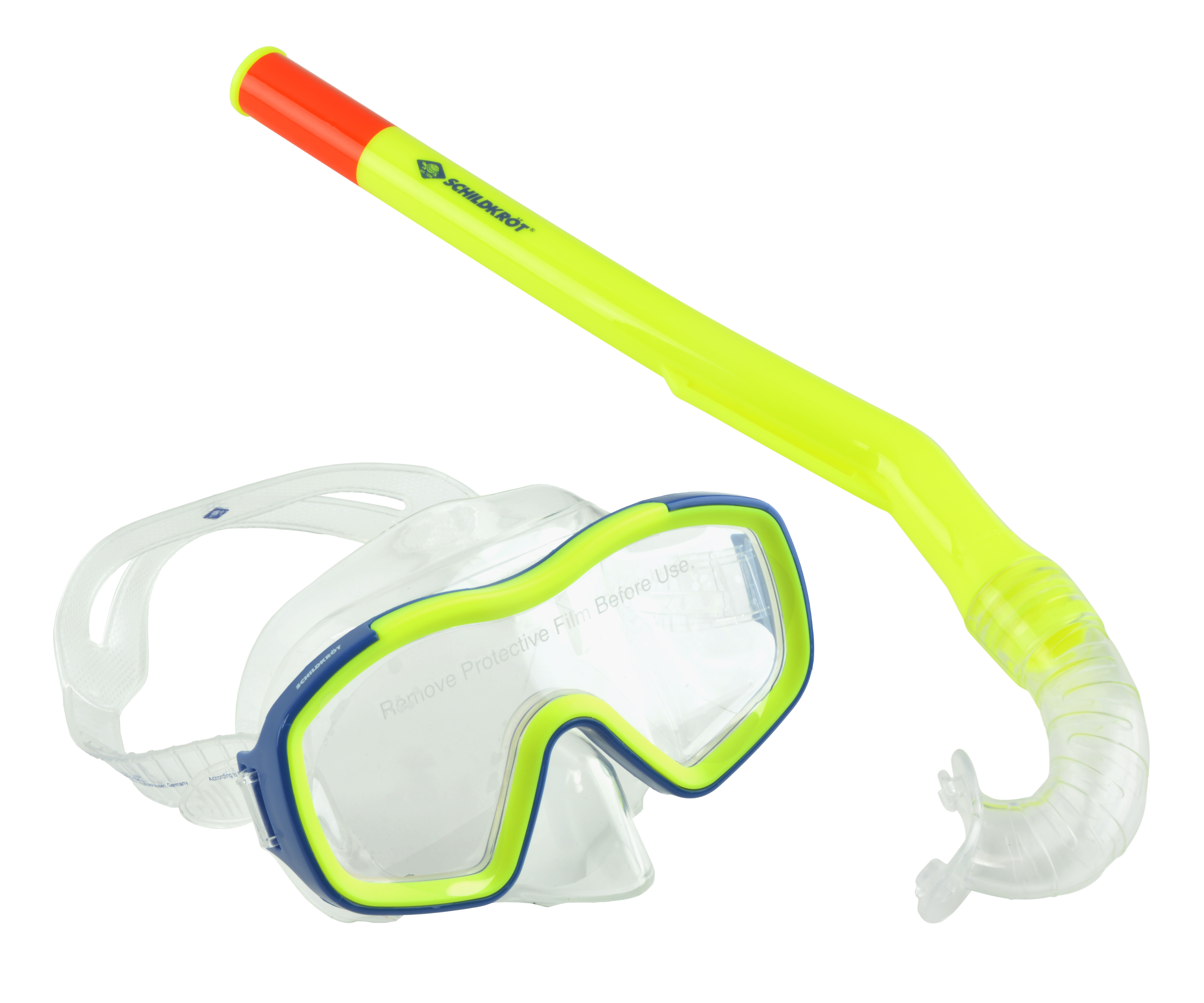 Dvoudílná sada se skládá z vysoce kvalitní masky s jednočočkovým sklem z robustního polykarbonátu (PC) a klasického šnorchlu s flexibilním náustkem.