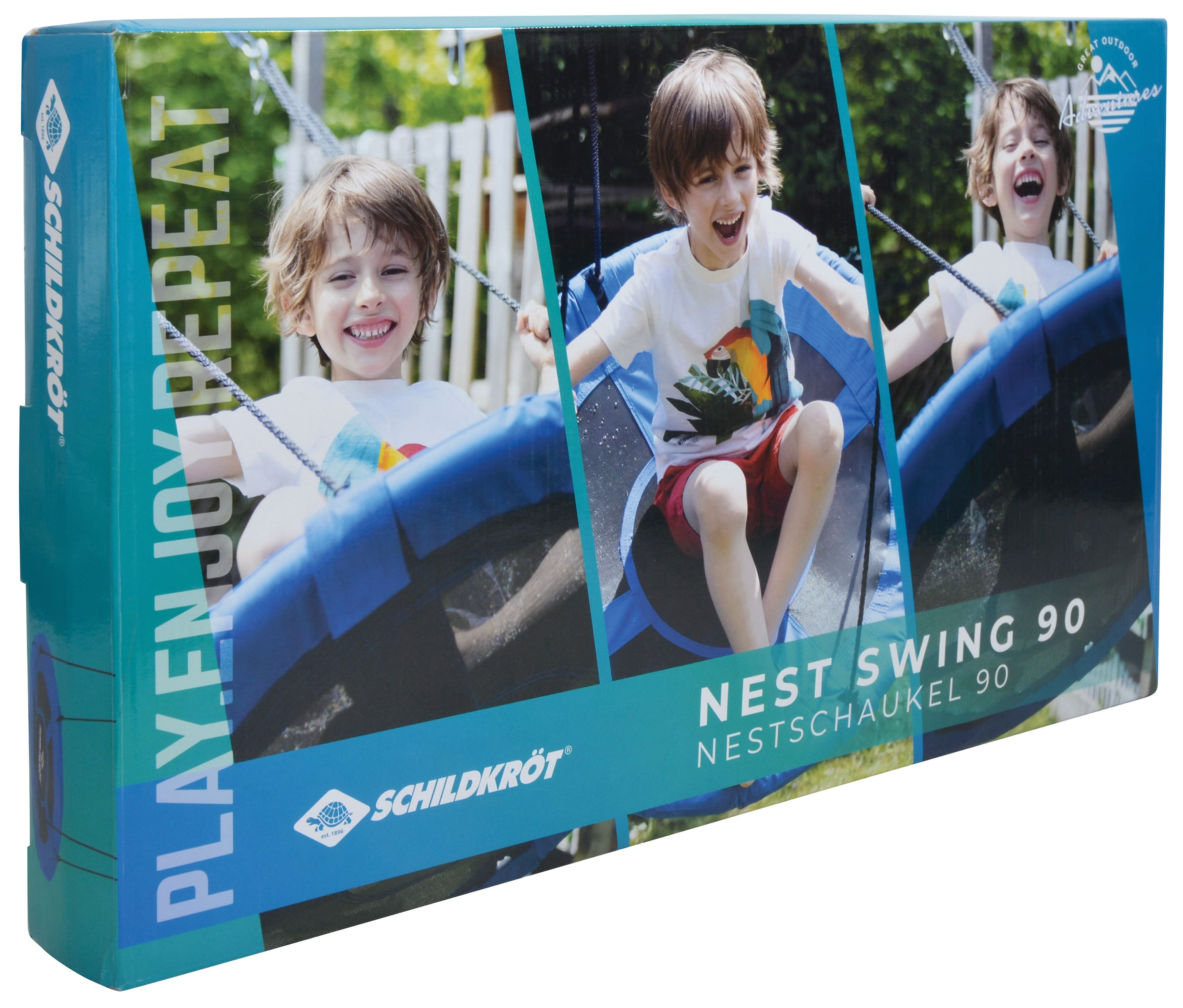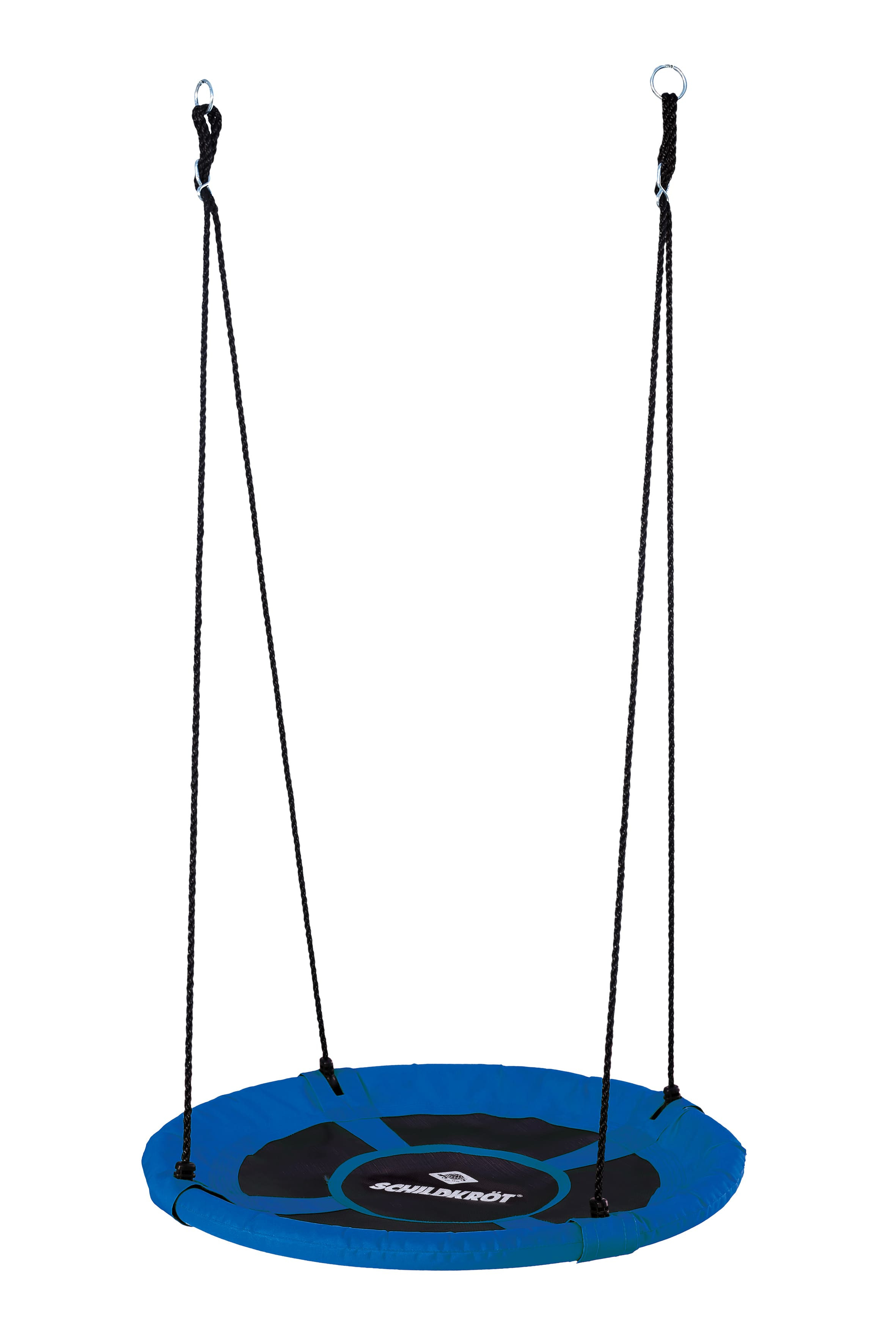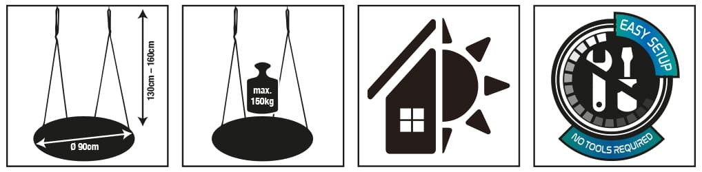 Houpací hnízdo o průměru 90 cm má pohodlné, ohraničené sedátko vyrobené z odolné plastové síťoviny (polypropylen). 4 rozměrově stabilní ocelové trubky (25 mm x 0,8 mm) mají ochranu proti nárazu a jsou vzájemně spojeny bezpečnostním zacvakávacím systémem. Nosná lana (Ø 10 mm) jsou výškově nastavitelná až do 160 cm pomocí dvou seřizovacích dílů ve tvaru osmičky a jsou připevněna k pojistným kroužkům. Houpací sítě Schildkröt lze používat uvnitř i venku.