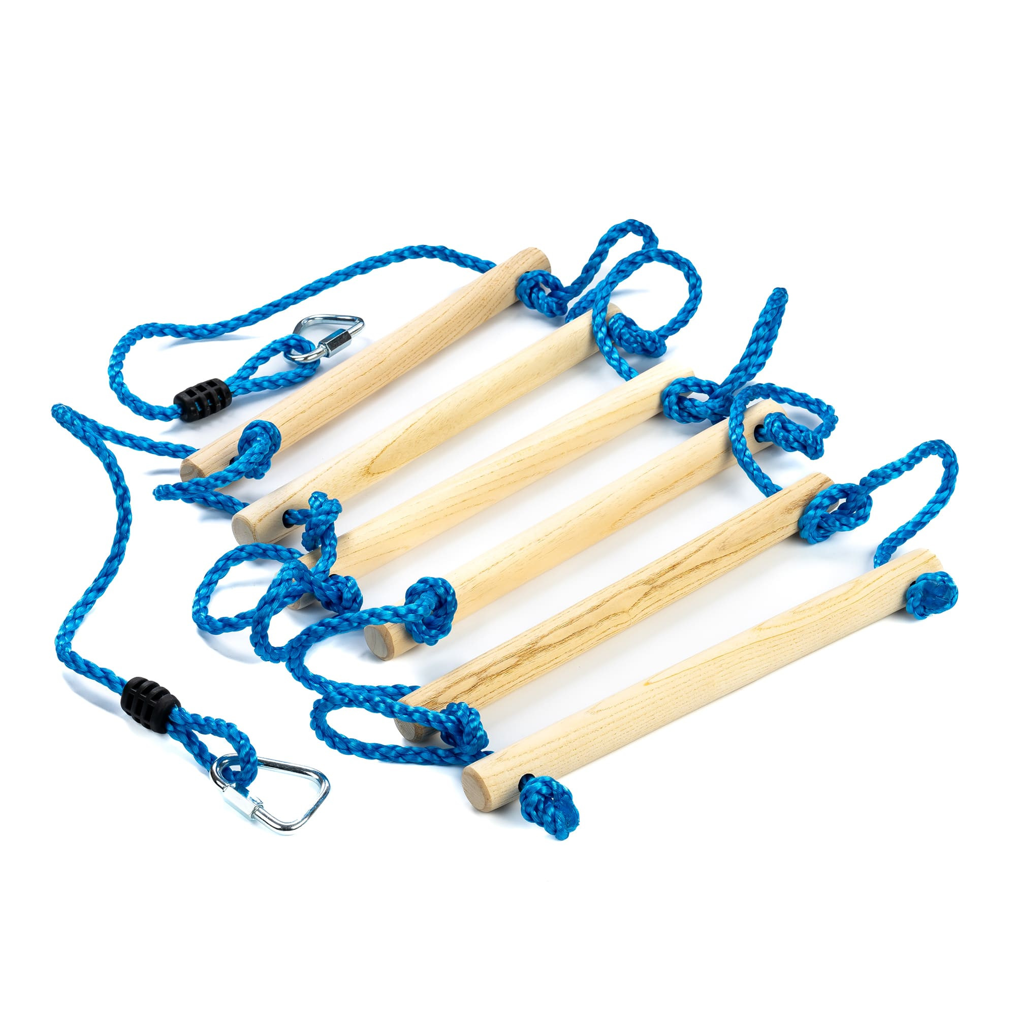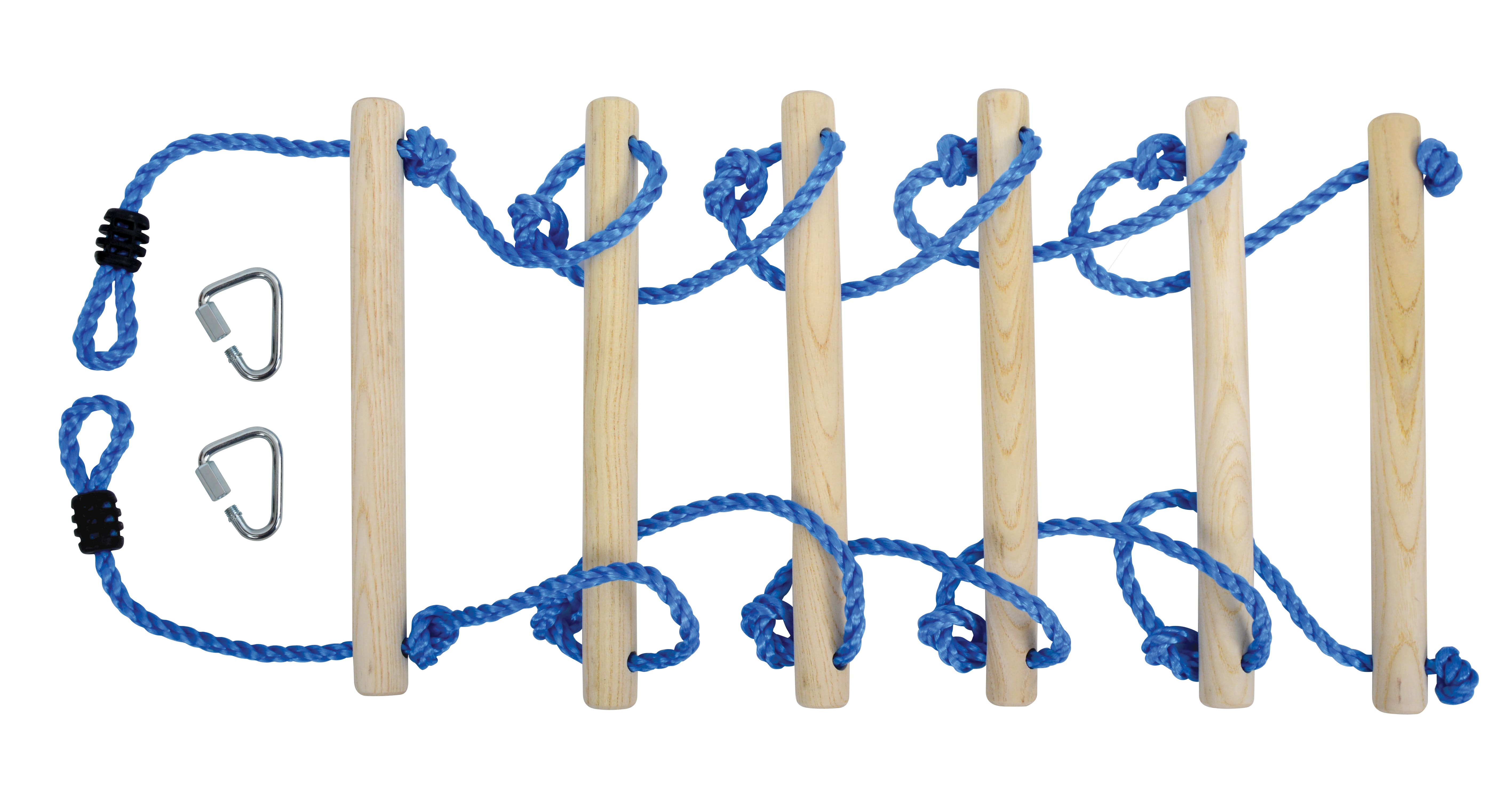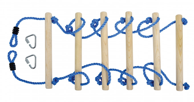 Pevný lanový žebřík (o průměru Ø 10 mm) měří celkem 250 cm. Je vyrobený z odolného a pevného plastového materiálu. Díky tomu je odolný vůči povětrnostním vlivům, takže je ideální pro venkovní použití. Lana doplňuje 6 příček z vysoce kvalitního, neošetřeného tvrdého dřeva (délka 38 cm, Ø 3,2 cm). Pomocí dvou bezpečnostních karabin, které jsou součástí balení, lze žebřík připevnit k překážkové dráze, houpačkám nebo použít k stromovým domečkům.