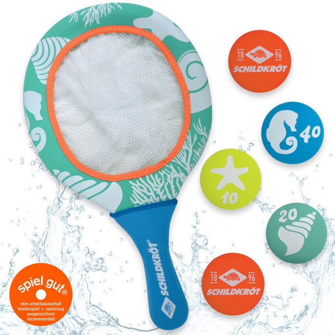 Otestujte svou rychlost a obratnost pod vodou s potápěcí hrou od Schildkröt. Pomocí protiskluzové neoprenové chytací sítě (40 × 22 cm) se snažíte zachytit 5 barevných potápěčských závaží, která padají do vody. Každé závaží má jinou váhu (cca 100 g, 70 g, 45 g), průměr 7 cm, a různou bodovou hodnotu. Těžší závaží s vyšším skóre se potápí rychleji a vyžadují rychlou reakci.