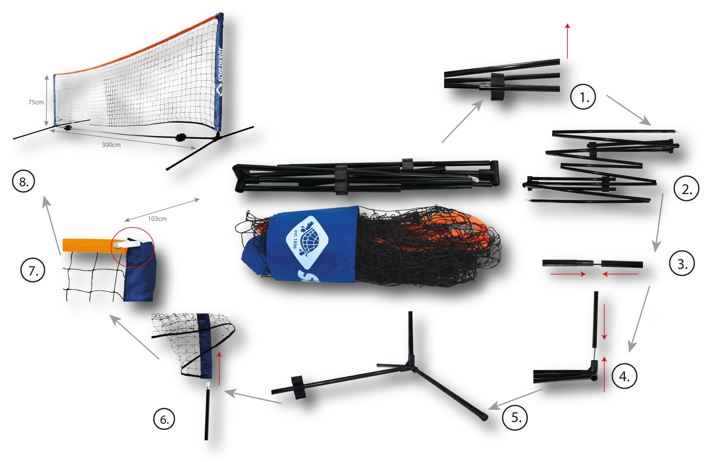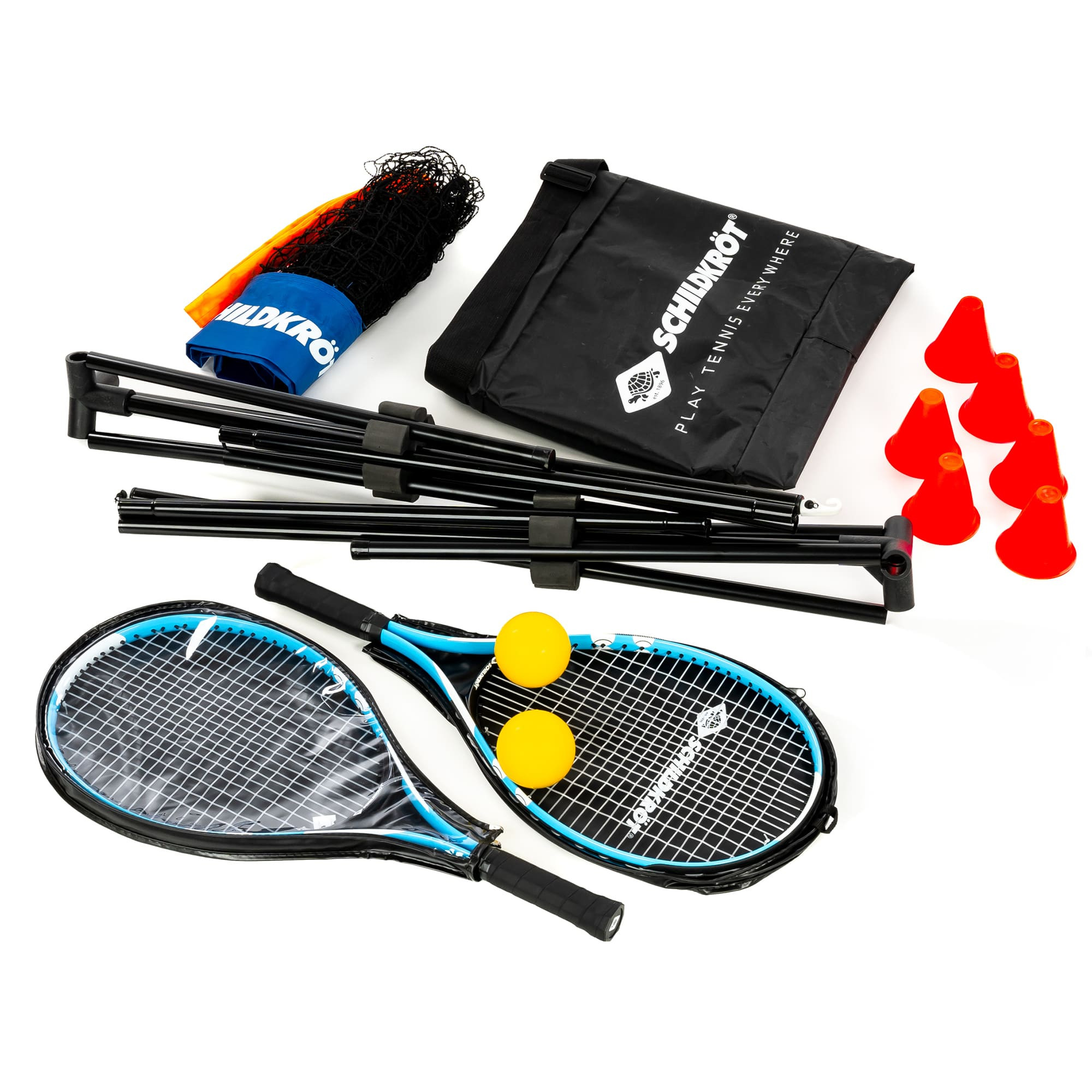 Díky této sadě na tenis od značky Schildkröt nic nestojí v cestě tenisovému zápasu. Tenisová sada obsahuje vše, co potřebujete ke hře: 2 rakety s ochrannými obaly, 2 míčky (Ø 7 mm), samostatně stojící síť (výška 75 cm, délka 300 cm) s ocelovými tyčemi a 6 plastových kuželů k vyznačení hracího pole.