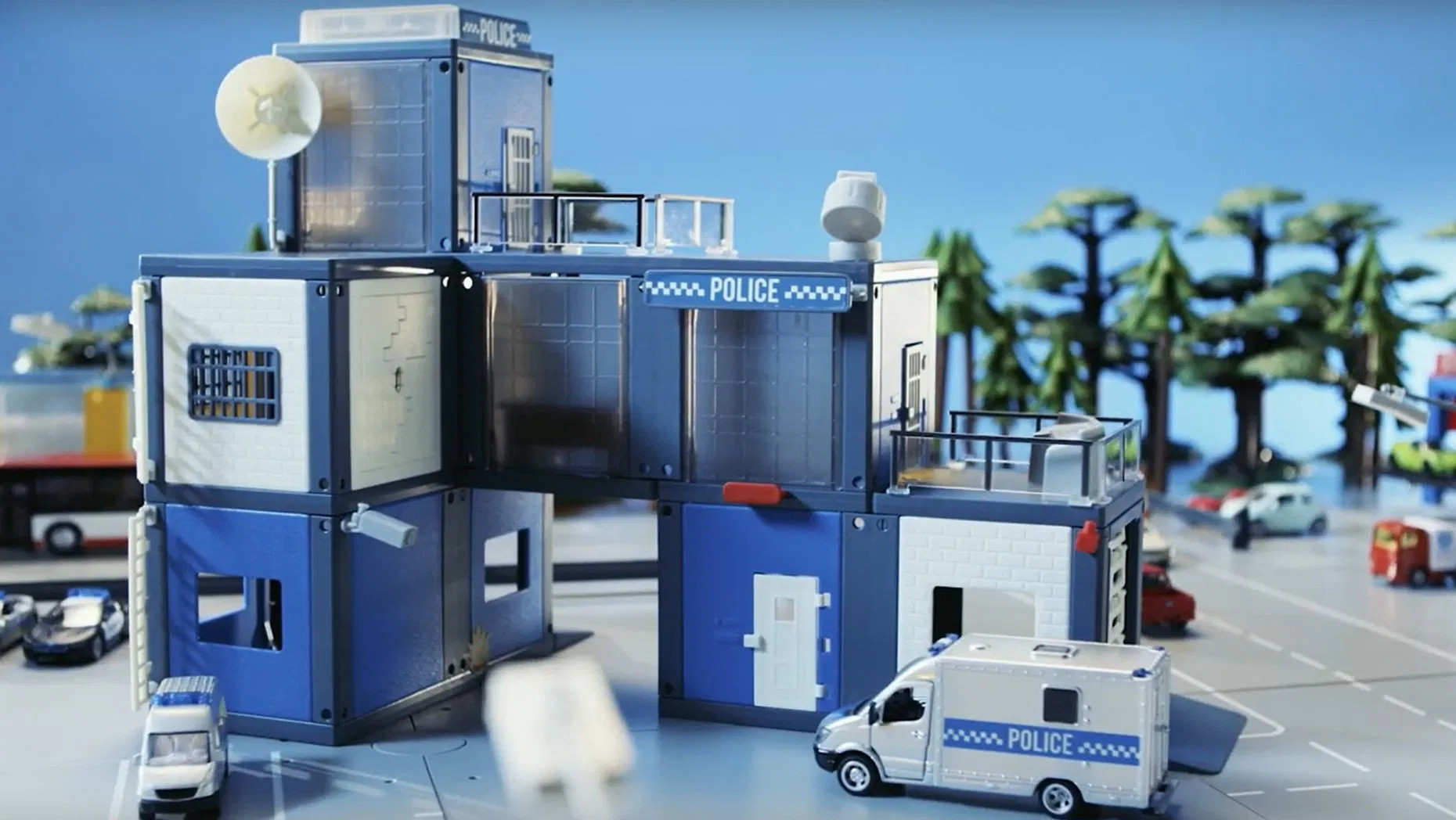 Policejní stanice s modulární stavebnicí umožňuje sestavit dvoupodlažní budovu v různých tvarech (L, U nebo vícepodlažní). Sada obsahuje více než 90 dílů, včetně stavebních prvků, samolepek a doplňků, které umožní dětem vytvořit detailní policejní stanici s realistickými prvky, jako jsou mřížovaná okna, anténa, padací dveře, žebříky, monitorovací kamera a střešní terasa. Stavebnice je navržena tak, aby podporovala kreativitu a motorické dovednosti dětí. Díky novému systému push-fit je stavění snadné a zábavné, a to i bez pomoci dospělých.