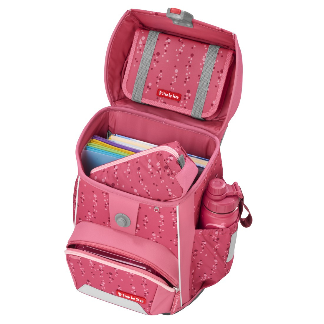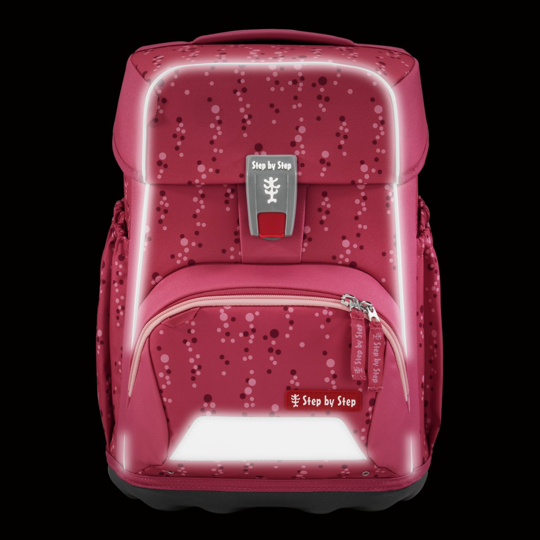 Prostorná jednokomorová aktovka, do které se vejde vše potřebné od pera až po sportovní potřeby. Minimalistická aktovka váží pouhých 950 g. Je vhodná pro děti od 1. do 4.třídy. Má ergonomicky tvarovaná záda s měkkým prodyšným polstrováním. Dokonalé polstrování zad, výškově a délkově nastavitelné polstrované popruhy zaručují zdravý vývoj zad dítěte, proto školní aktovky Step by Step získaly certifikát AGR.