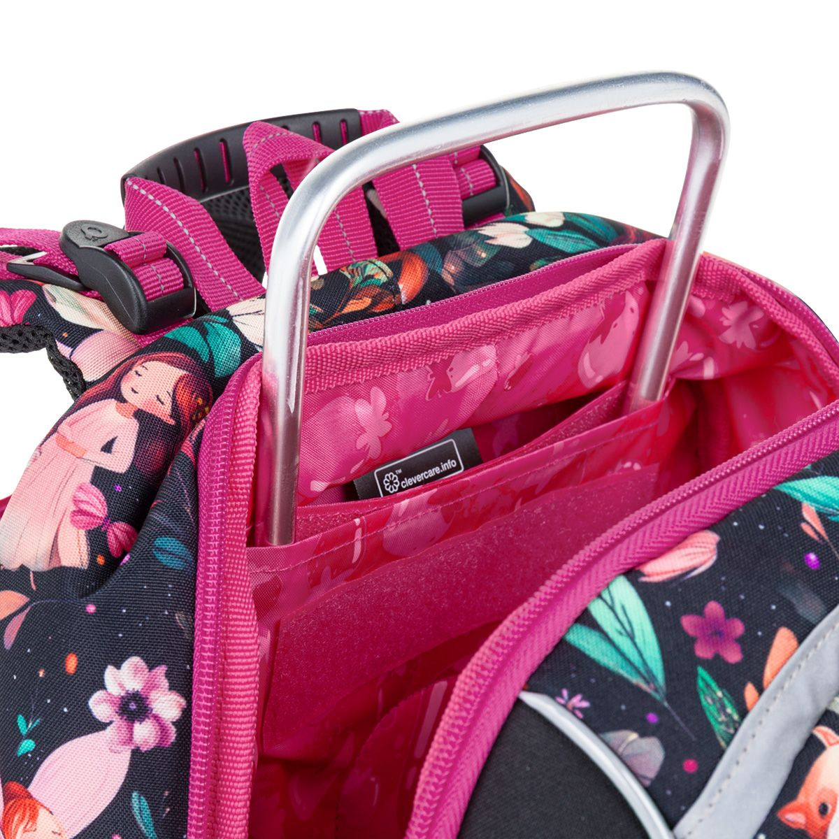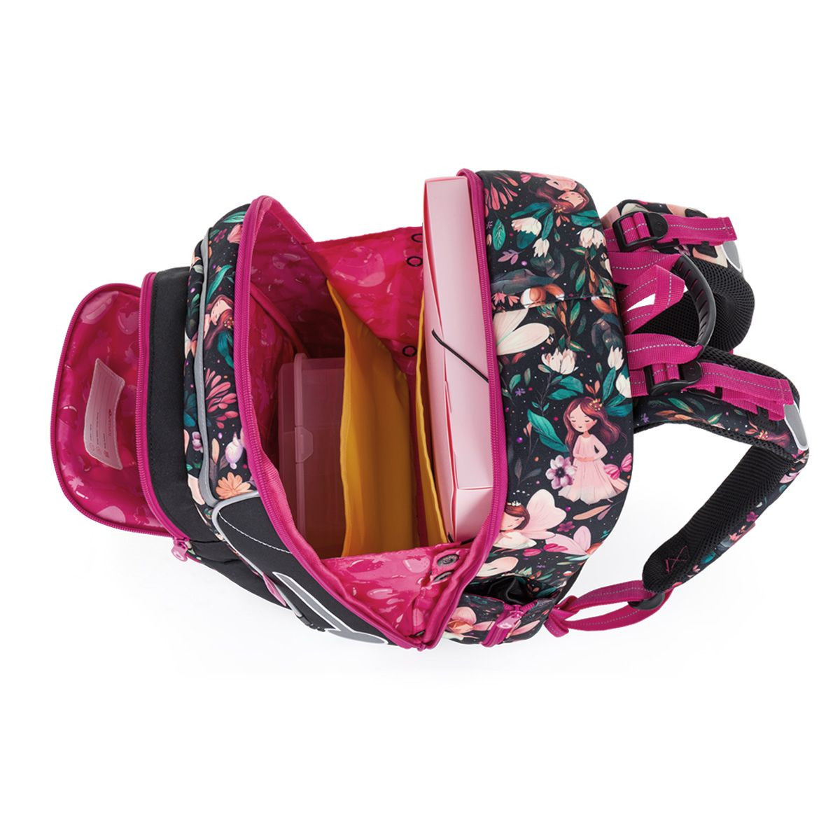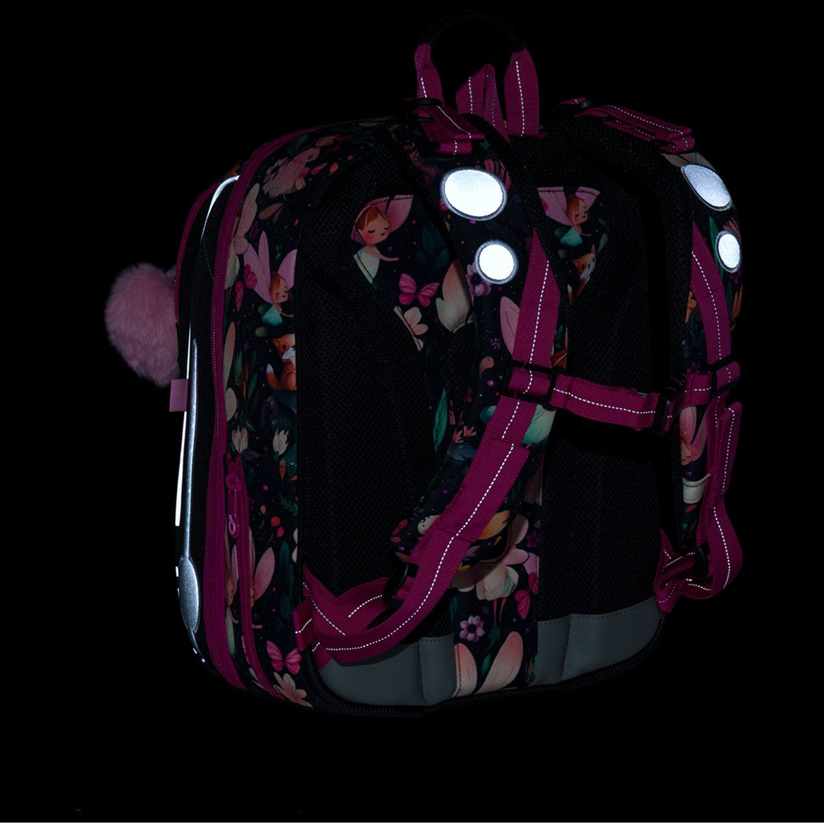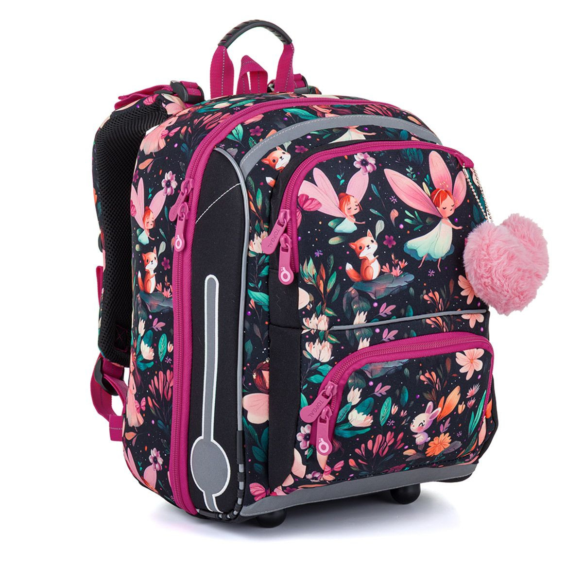 Školní aktovka Čarovný les je navržená s ohledem na potřeby malých školaček – je lehká, přehledná a krásně sedí na zádech. Romantický motiv víl, květin a lesních zvířátek v kombinaci s růžovými detaily z něj dělá batoh, kterou si děti zamilují na první pohled. Lehká, stabilní a promyšleně řešená aktovka je ideální volbou do první třídy.
