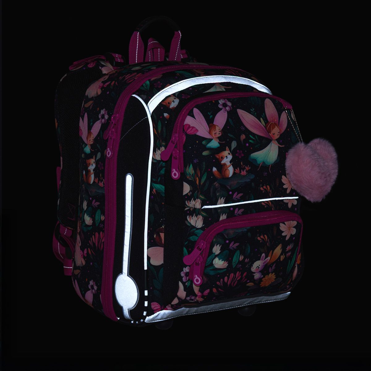 Vnitřní prostor je prakticky rozdělený, aby se školní potřeby snadno organizovaly. Nechybí reflexní prvky pro lepší viditelnost a bezpečnost na cestě do školy. Roztomilý chlupatý přívěsek pak dodává batohu hravý detail, který potěší každou malou parádnici.