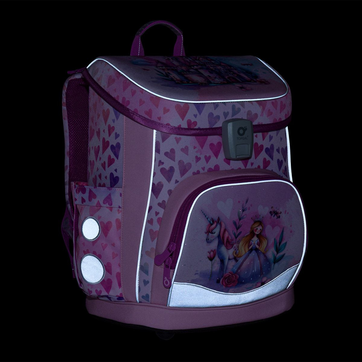 Pohádkový růžovo-fialový motiv s princeznou a jednorožcem, doplněný jemnými srdíčky a třpytivými detaily, dodává aktovce kouzelný vzhled. Vaše malá školačka si ji zamiluje na první pohled.