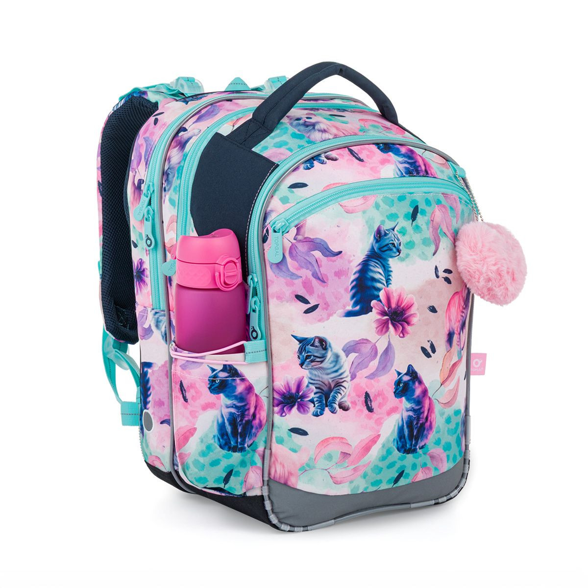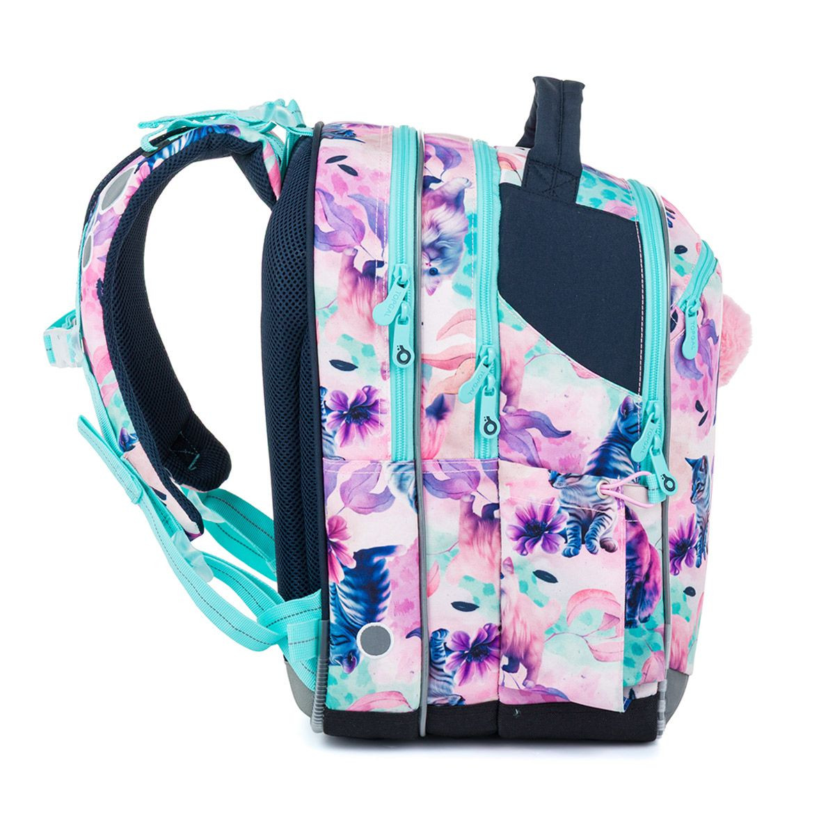 Na bocích batohu jsou kapsy na lahev – pohodlně se do nich vejde například lahev na pití o objemu 0,5 l. Samozřejmostí jsou reflexní prvky, které zvyšují bezpečnost dítěte na cestě do školy i ze školy. Spodní část batohu je vyztužená a chráněná proti oděru, takže batoh dobře drží tvar a zvládne i každodenní školní provoz.