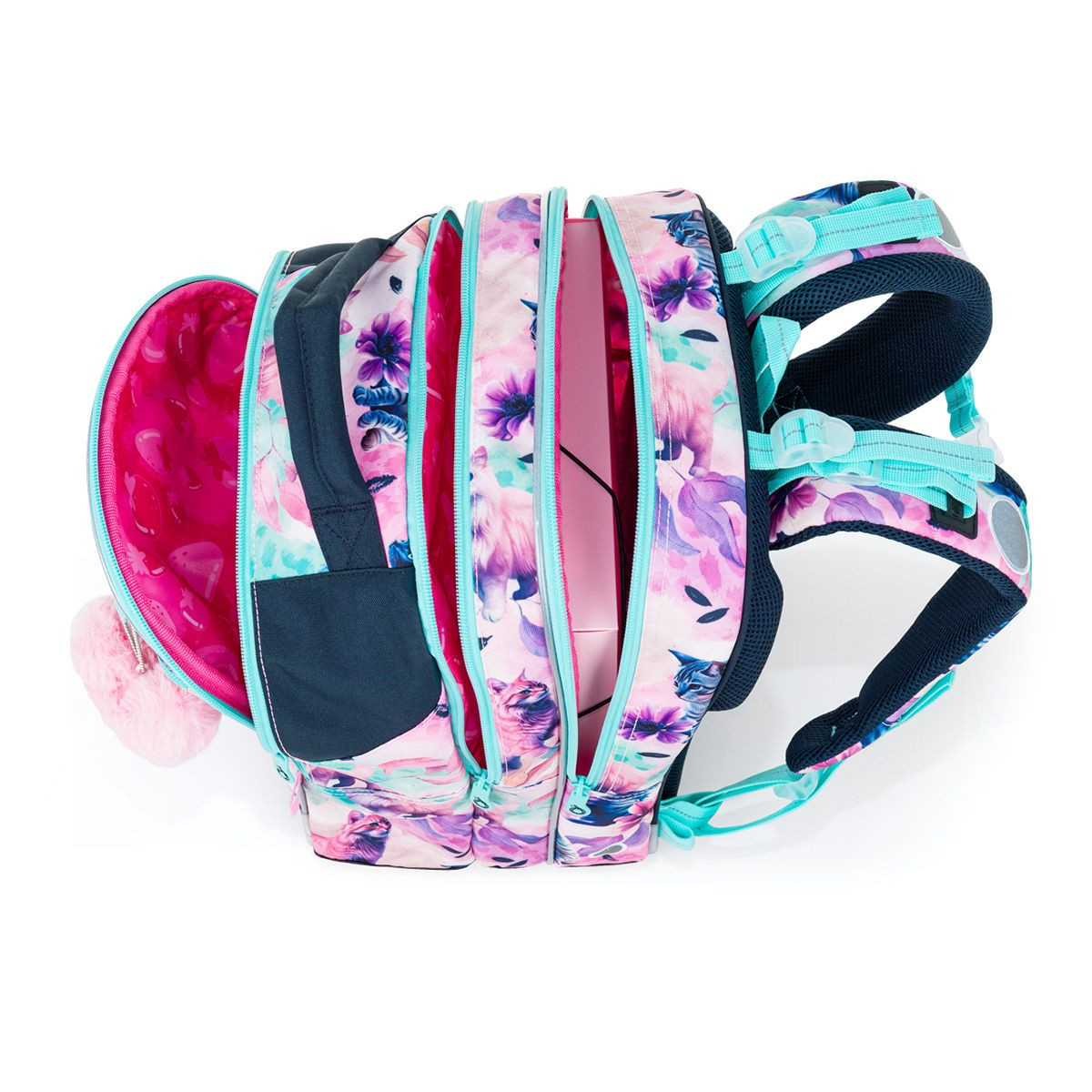 Batoh má ergonomicky tvarovaná záda a měkce polstrované ramenní popruhy, které se snadno přizpůsobí postavě dítěte. Díky výškově nastavitelné hrudní přezce batoh dobře drží na zádech a neklouže ani při pohybu. Vnitřní prostor je rozdělený do více komor pro snadnou organizaci školních pomůcek. Do zadní části batohu doporučujeme uložit těžší učebnice nebo desky na sešity.
