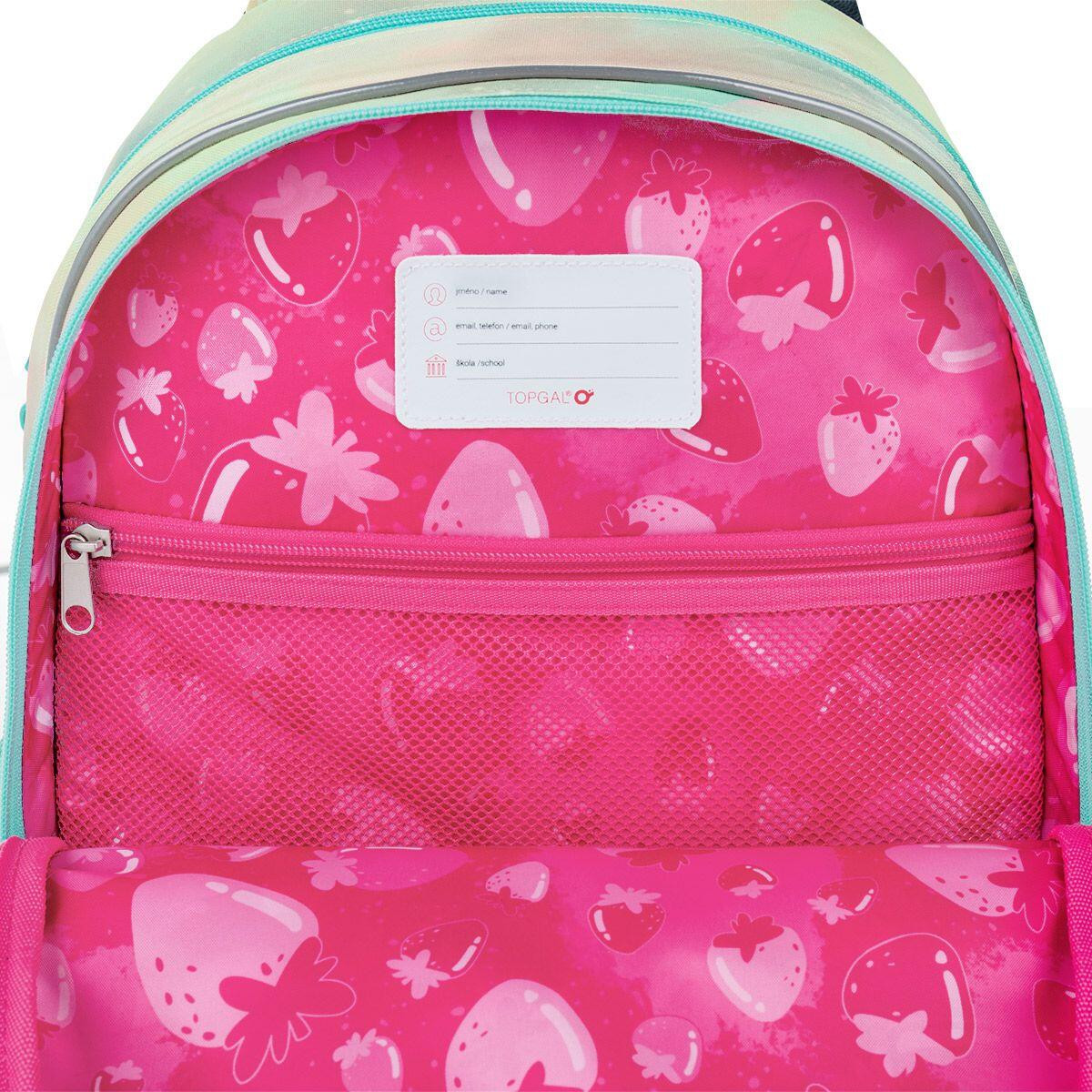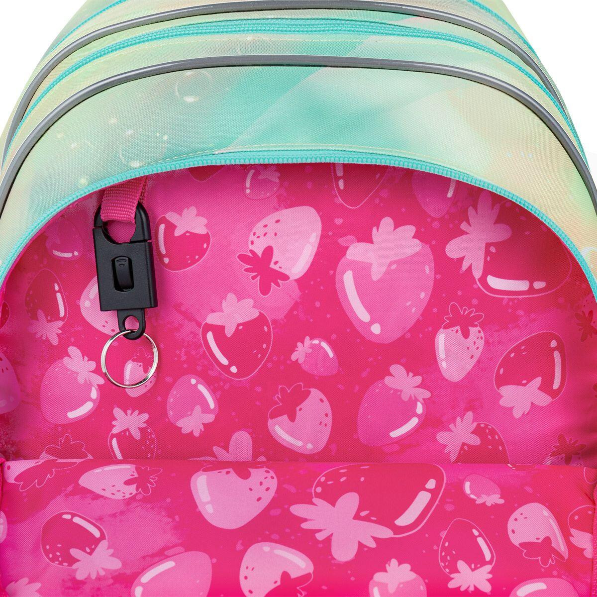 Batoh má dvě objemné hlavní komory. Zadní komora je objemnější a spolehlivě pojme všechno těžké učivo. Přední komora je o něco užší a skrývá malou síťovou kapsu na zip a jmenovku. Do přední hluboké kapsy se vejde penál ve stejném designu nebo krabička na svačinku. Je v ní také karabina, díky níž odpadne složité hledání klíčů na dně batůžku.
