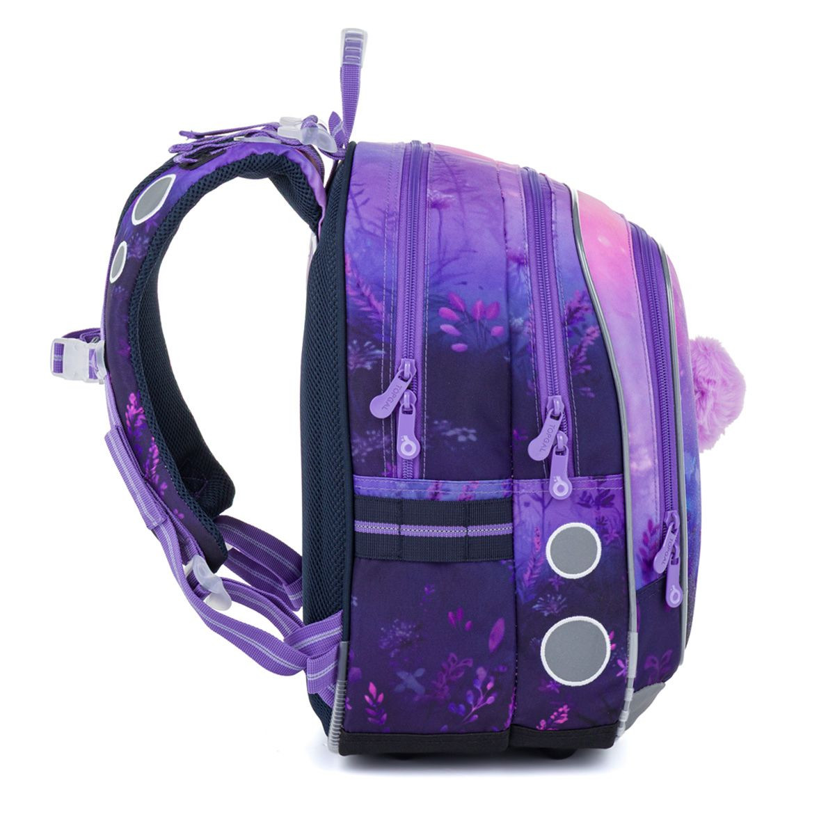 Lehký dvoukomorový batoh ENDY váží jen něco málo přes kilogram a perfektně padne drobným školačkám od první do třetí třídy ZŠ. Anatomicky tvarovaná záda, pevné dno a chytré členění poskytne dětem maximální komfort i pořádek po celý školní den. Díky roztomilému motivu fialového králíčka a měkoučkému bambulkovému přívěsku se rychle stane oblíbeným společníkem každé malé slečny.