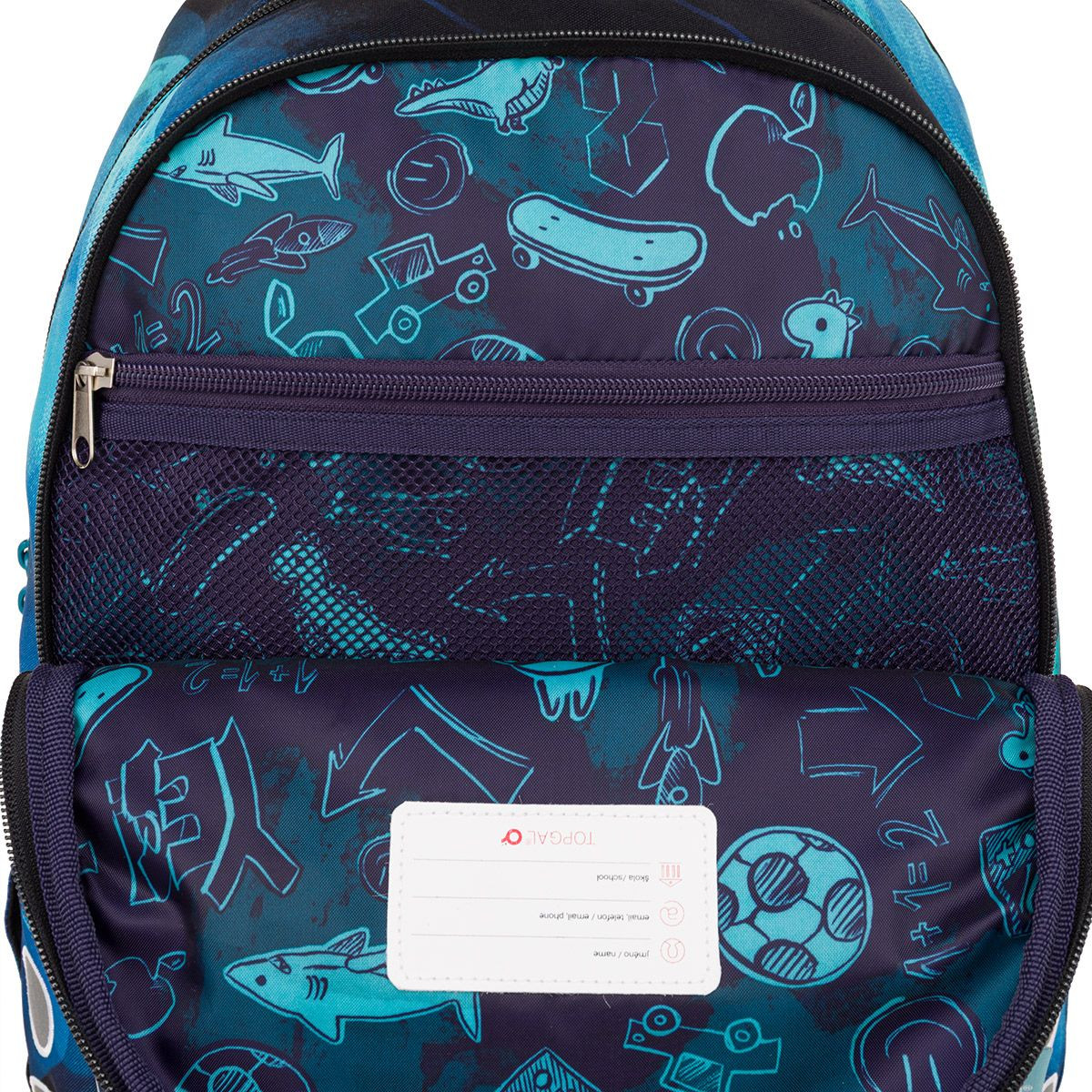 V zadní komoře najdete praktický organizér na učebnice a desky na sešity. Přední komora se hodí na penál nebo krabičku se svačinou, uvnitř je navíc síťovaná kapsa na zip a jmenovka. Po stranách batohu jsou dvě kapsy na pití – ideální na lahev na pití o objemu 0,5 l.