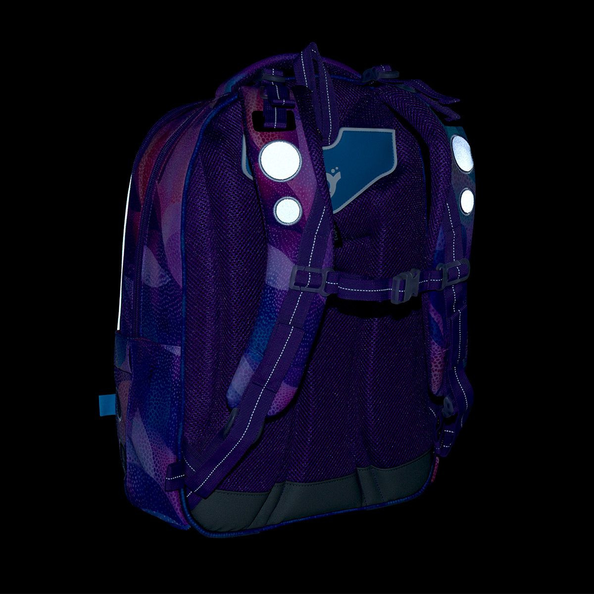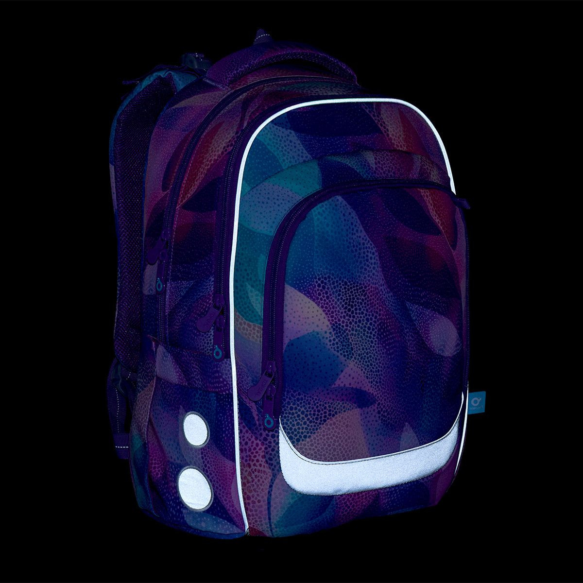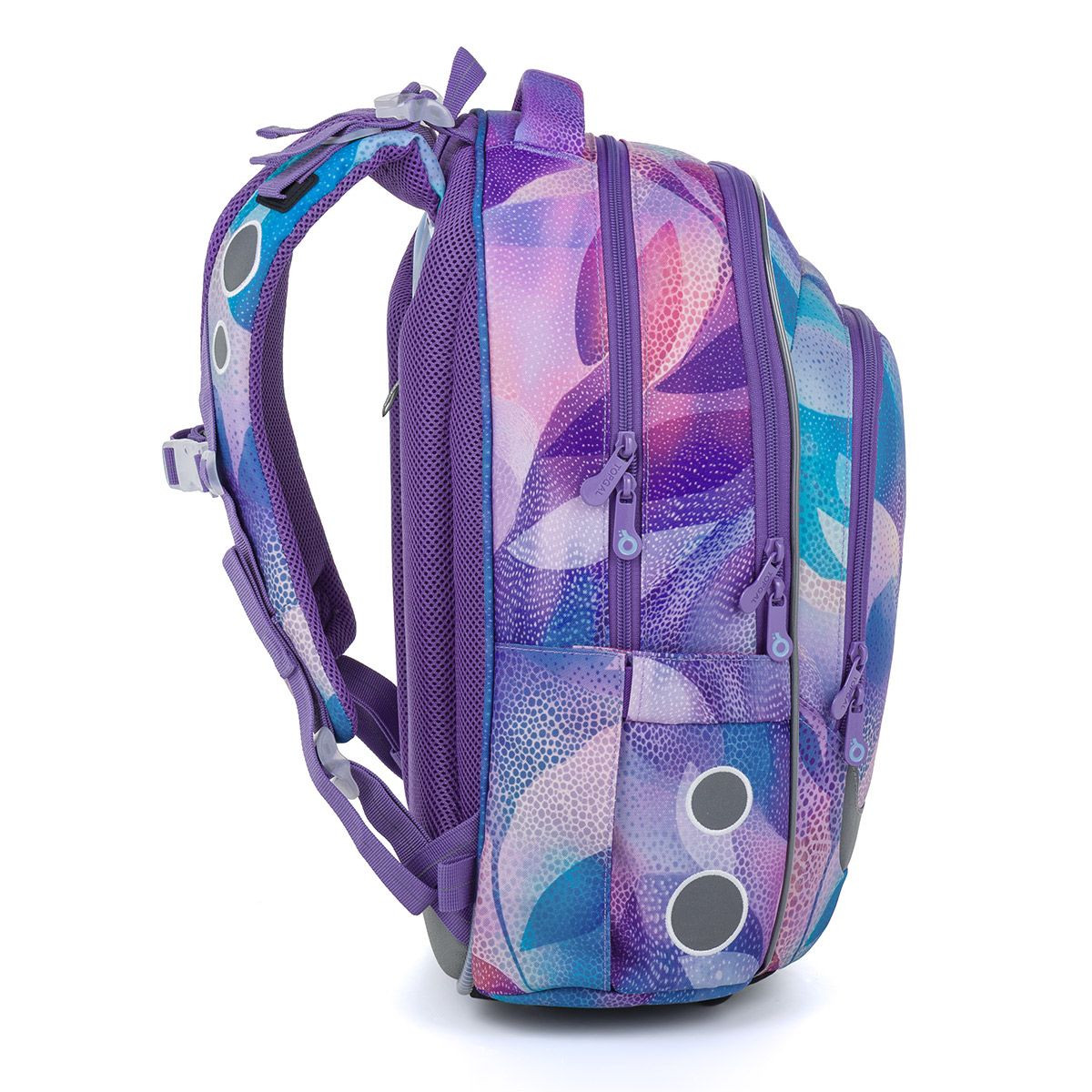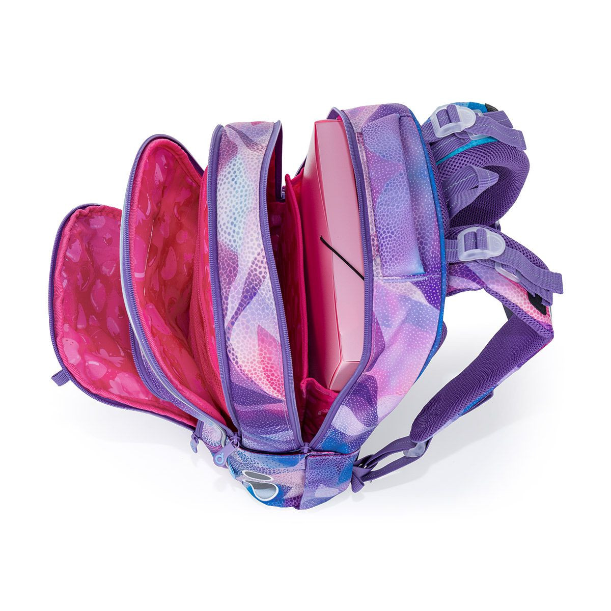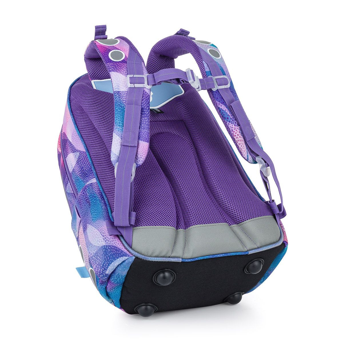 Lehký a praktický školní batoh pro školačky od 125 cm. Díky svému objemu 27 litrů i konstrukci bez problémů vydrží až do 6. třídy. Pastelový abstraktní motiv v odstínech fialové, růžové a tyrkysové působí jemně, ale zároveň originálně – batoh tak skvěle doplní školní i volnočasový styl. Batoh má ergonomicky tvarovaná záda a měkce polstrované ramenní popruhy, které se snadno přizpůsobí rostoucí postavě dítěte. Výškově nastavitelná hrudní přezka pomáhá udržet batoh stabilně na zádech a zvyšuje pohodlí při každodenním nošení.